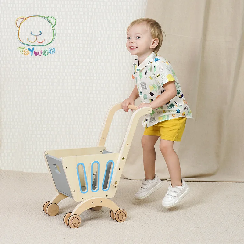 Wooden Kids Shopping Cart Toy Realistic Supermarket Play Set with Smooth Wheels for Toddlers Role Play Games