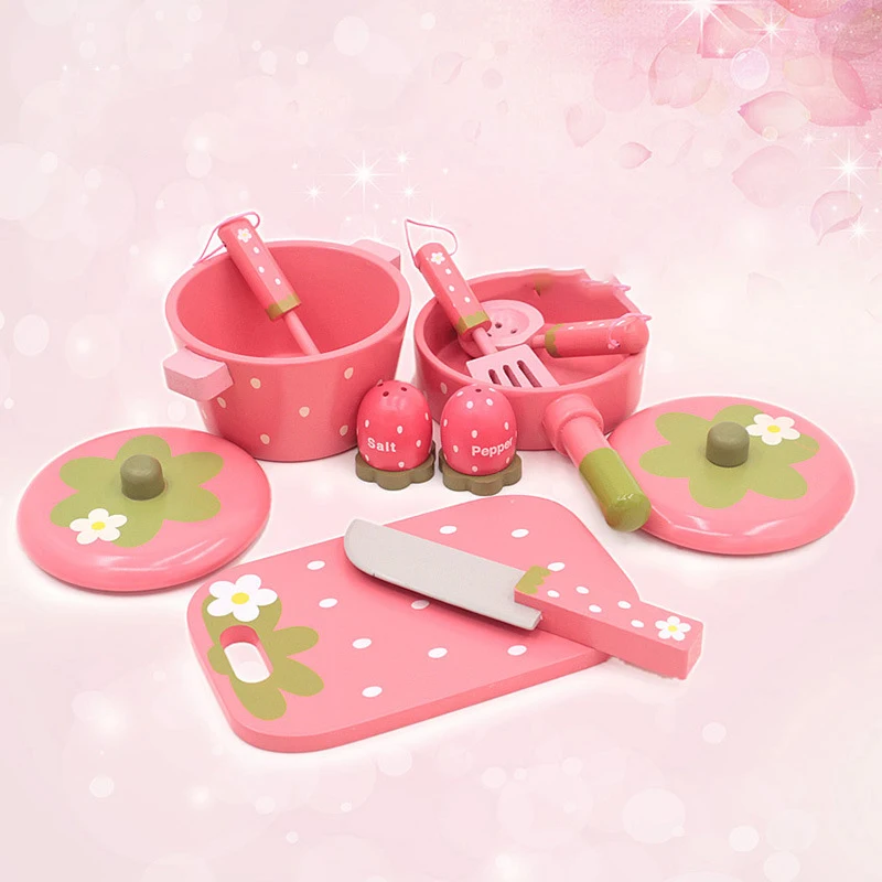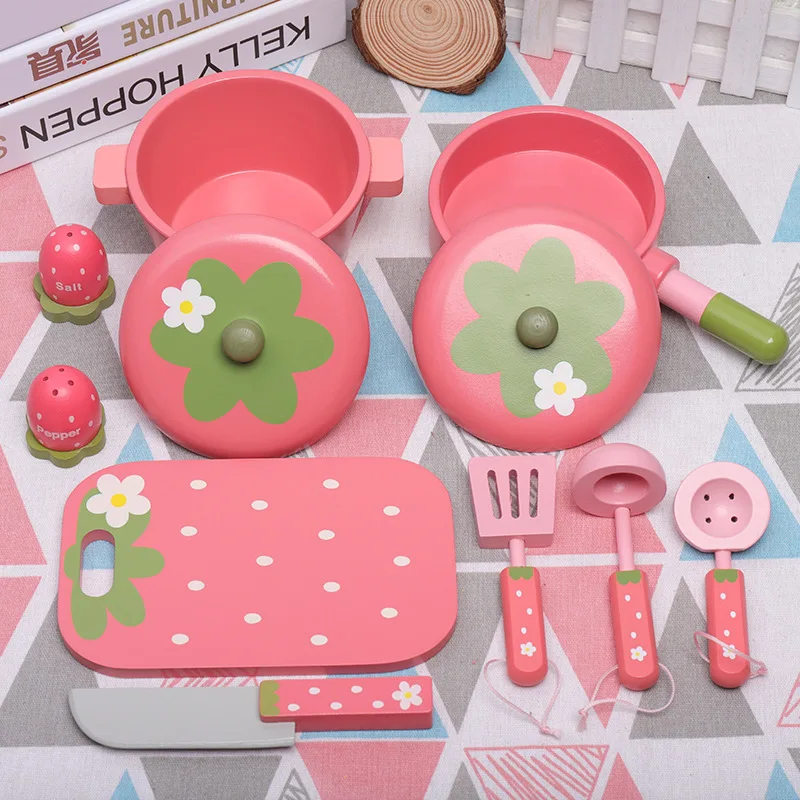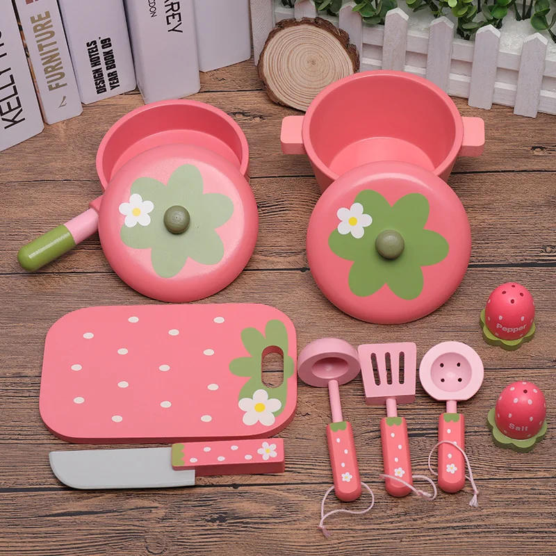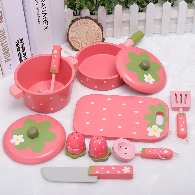 Fresh Designs Children's Pink-themed Strawberry Wooden Cooking Pots Set Juguetes Pretend-play Kitchen Toys for Kids Boys Girls