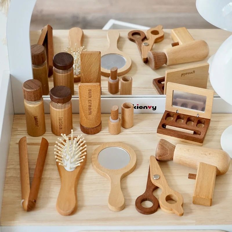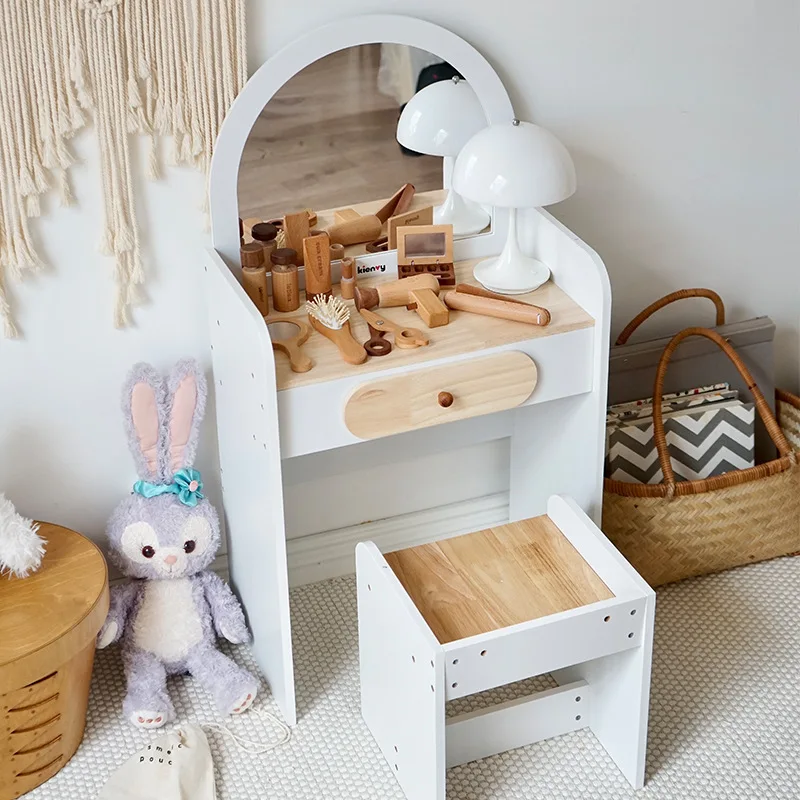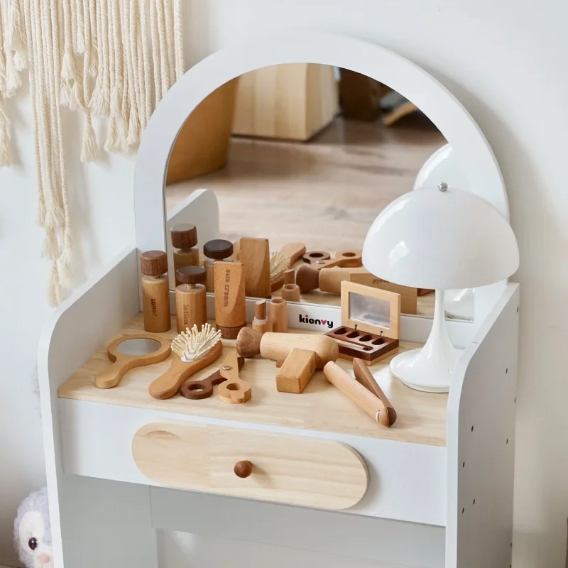 Wooden Princess Makeup Bag Set with Dressing Table Hair Cutting Toys for Girls Pretend Play House Puzzle and Role Play Fun Toy