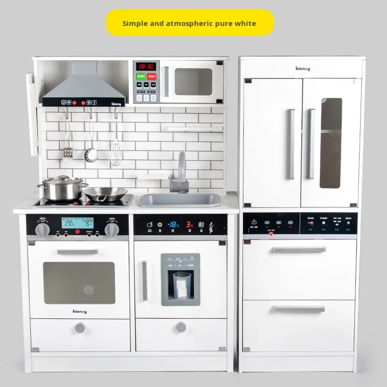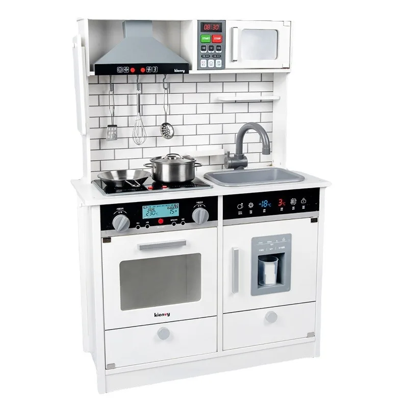 Interactive Wooden Play Kitchen Toy Set with Realistic Sound Light Effects and Refrigerator for Kids Pretend Play