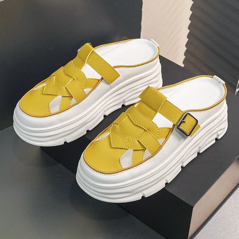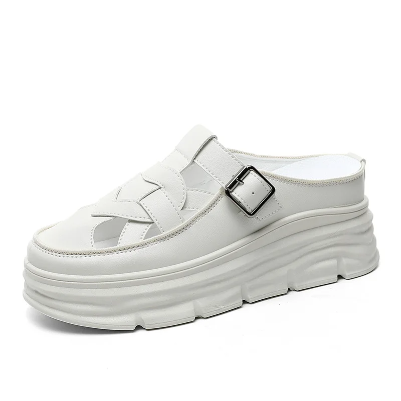 W3609 New Versatile Women's Slippers Summer Trendy Hollow Breathable Half Slippers Thick Sole Elevated Shoes