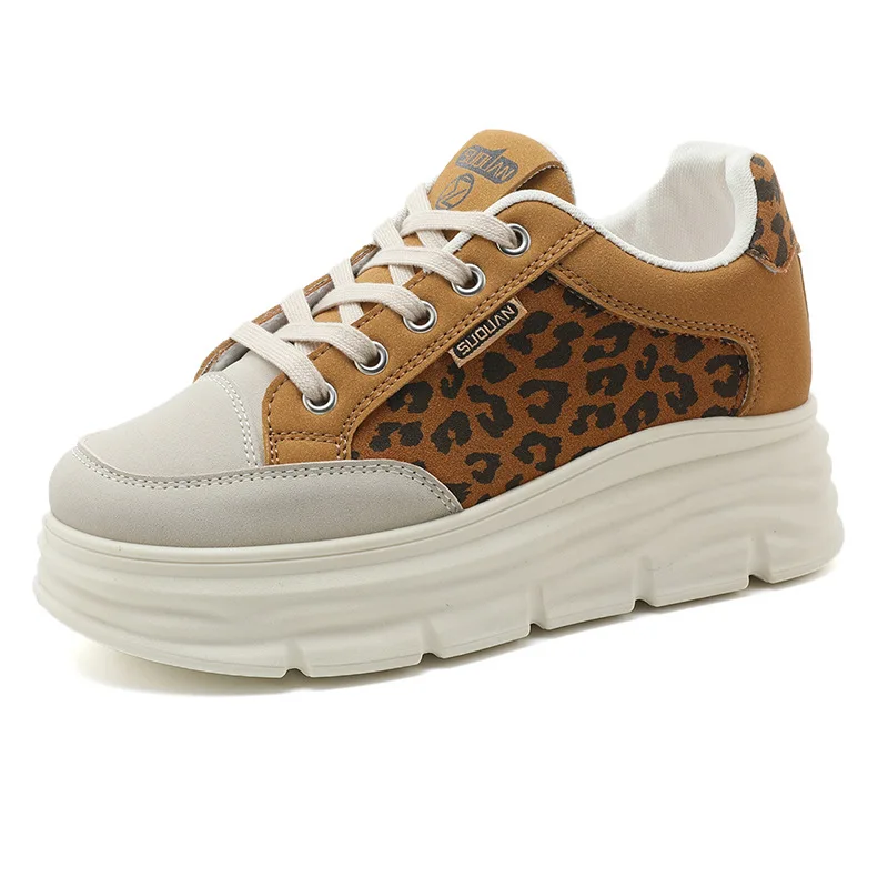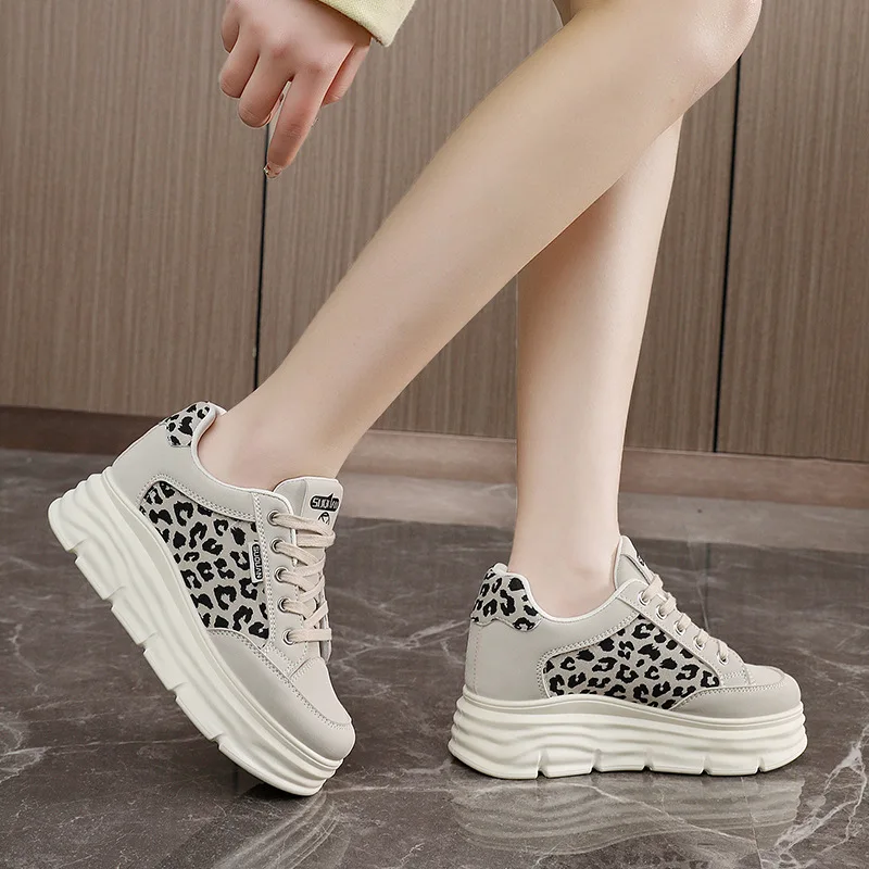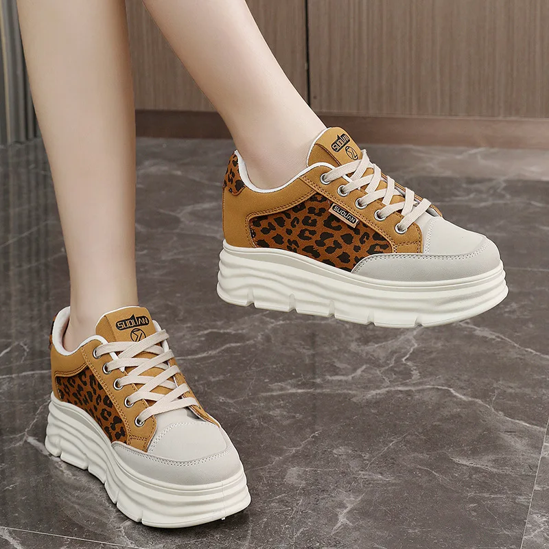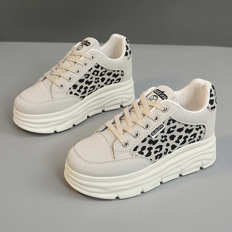 W3688 New Leopard Design Breathable Women's Shoes With Thick Sole and Raised Leather Surface Casual Sneakers