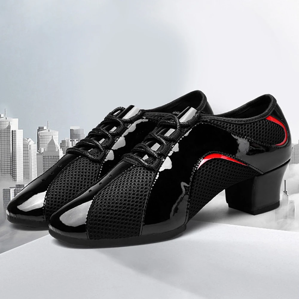 Women Adult Leather+Net Modern Dance Shoes Low-Heeled Soft-Soled Salsa Dance Shoes