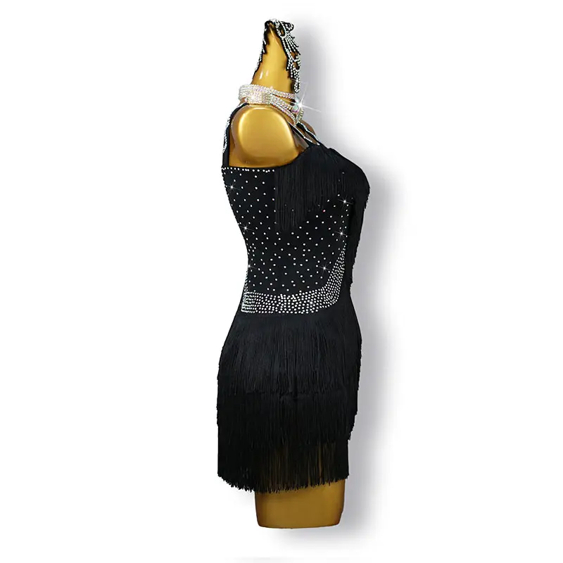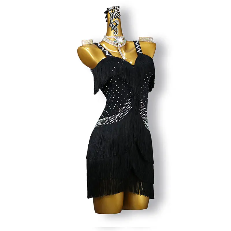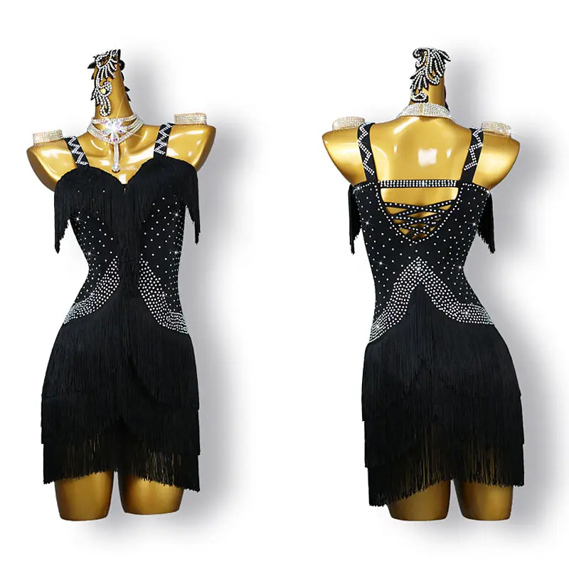 Black Performance Dance Dress Practice Costume Rhinestone Tassel Ladies Latin Competition Costumes Women Dance Skirt