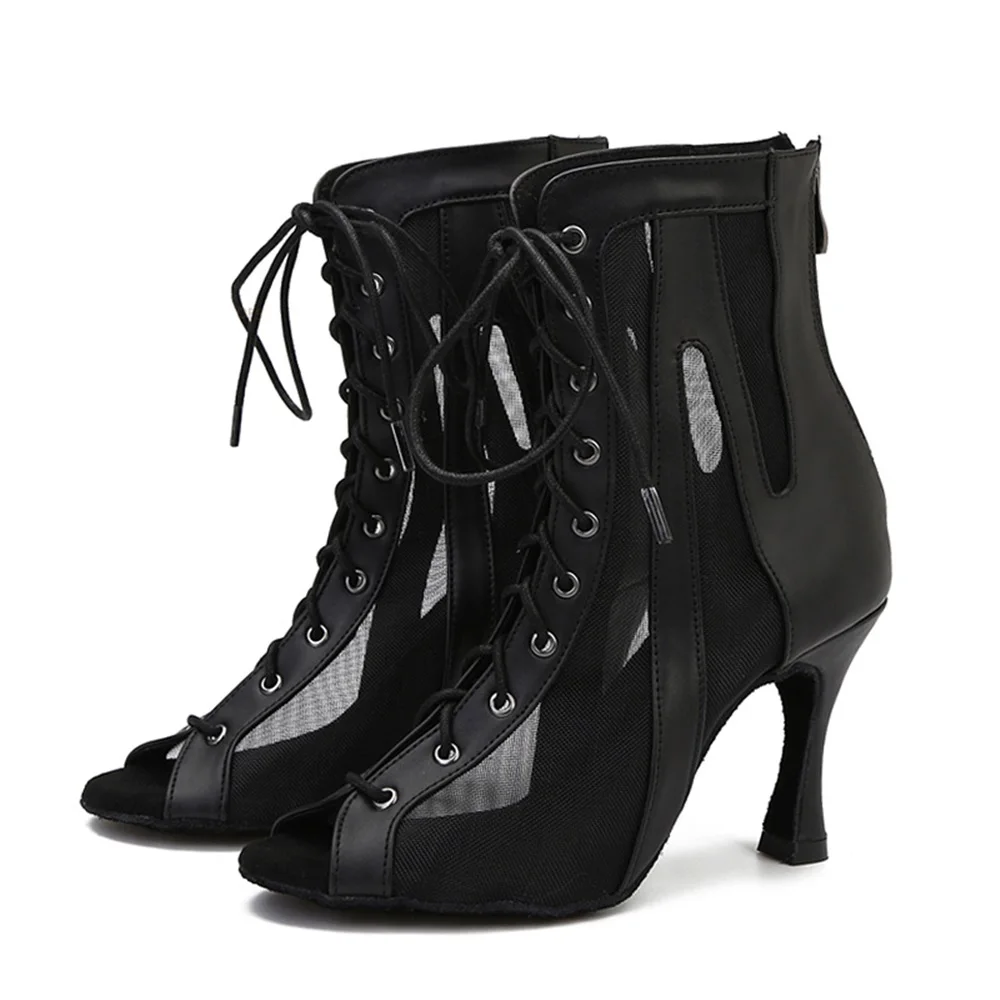 Adult Women Black Mesh Lace-Up High-Top Jazz Dance Boots Soft-Soled High-Heeled Latin Dance Shoes