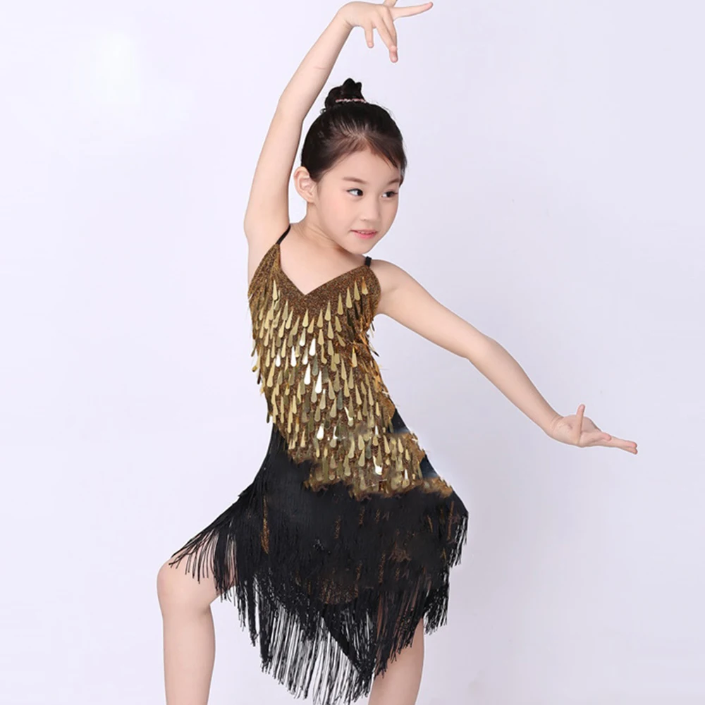Girls Ballroom Children Latin Costume Soft and Comfortable Spandex Sequined Fringed Dance Skirt Fashion Sling Stage Costume