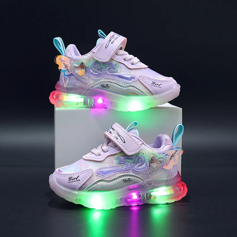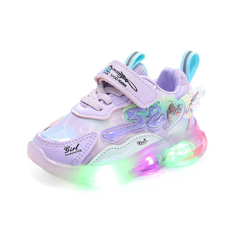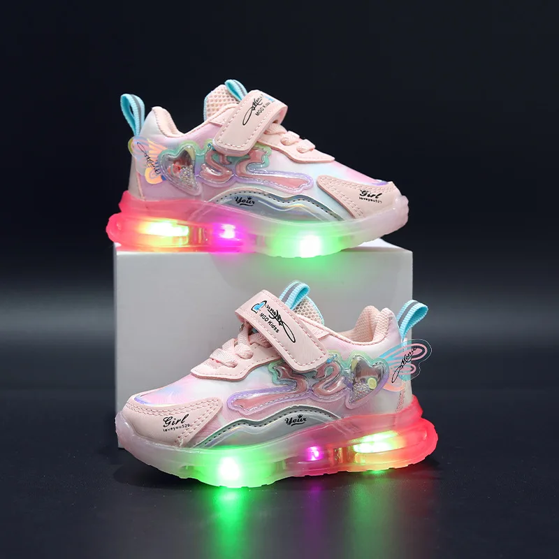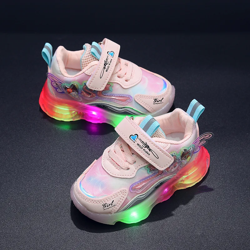 Spring New Cartoon Design Breathable Mesh Led Light Sports Shoes for Kids Lightweight Small Medium-Sized Girls Shoes Wholesale