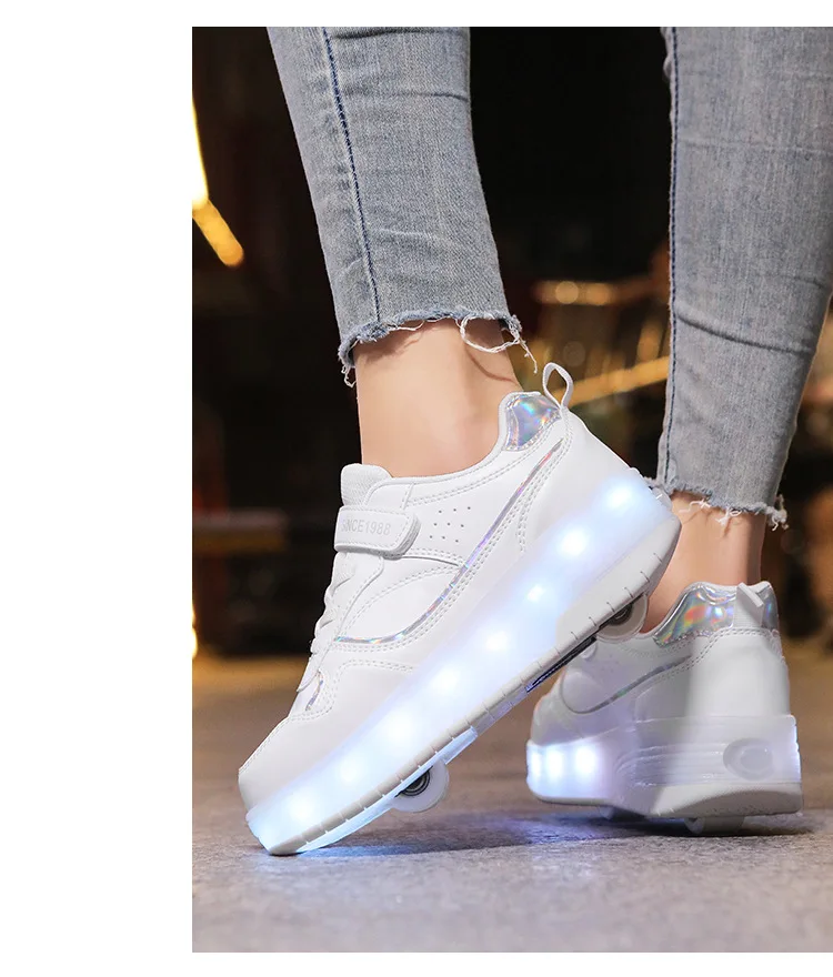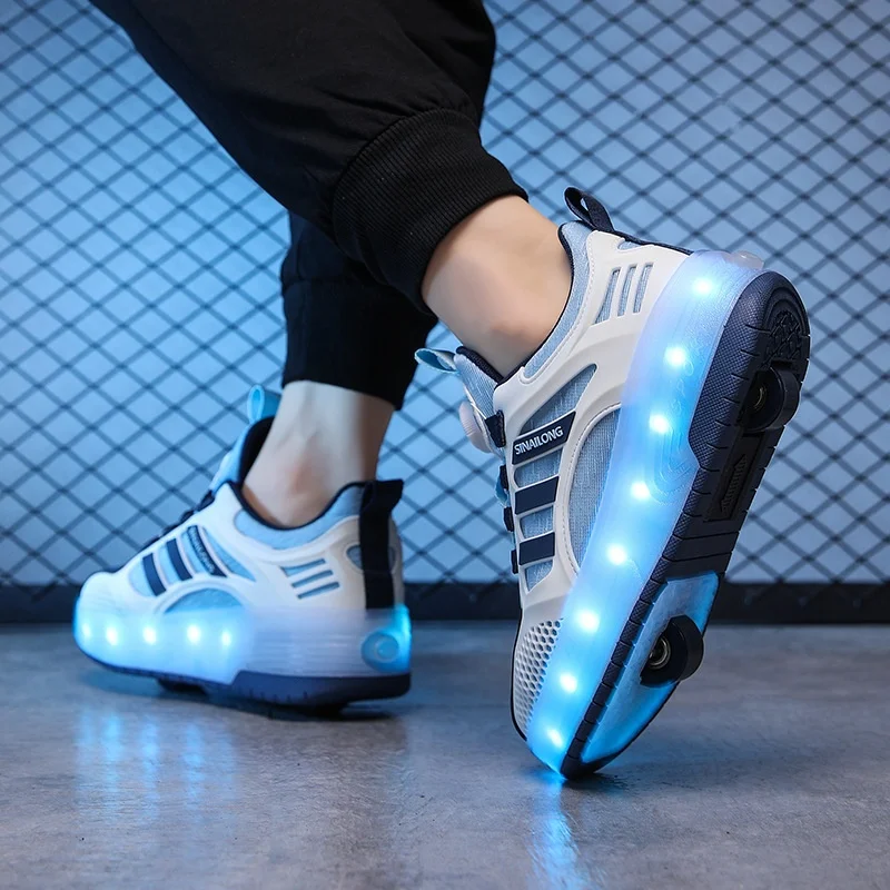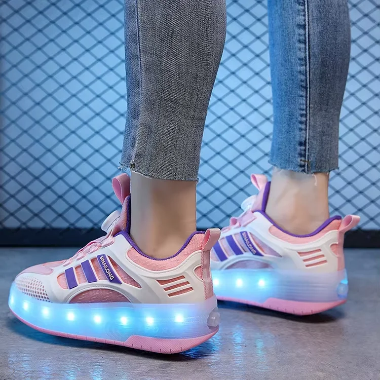 Trendy Children's Button Breathable Roller Skates Boys' Girls' LED Light Double Wheel Sport Shoes for Kids