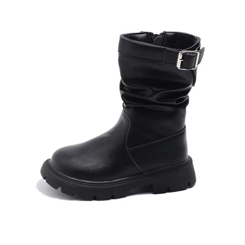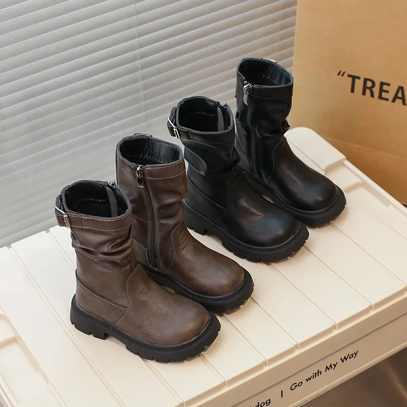Girls' British Style Mid-Calf for Boots 2026 Autumn Fashionable Chimney Short Artificial Leather Side Zipper Rubber Outsole
