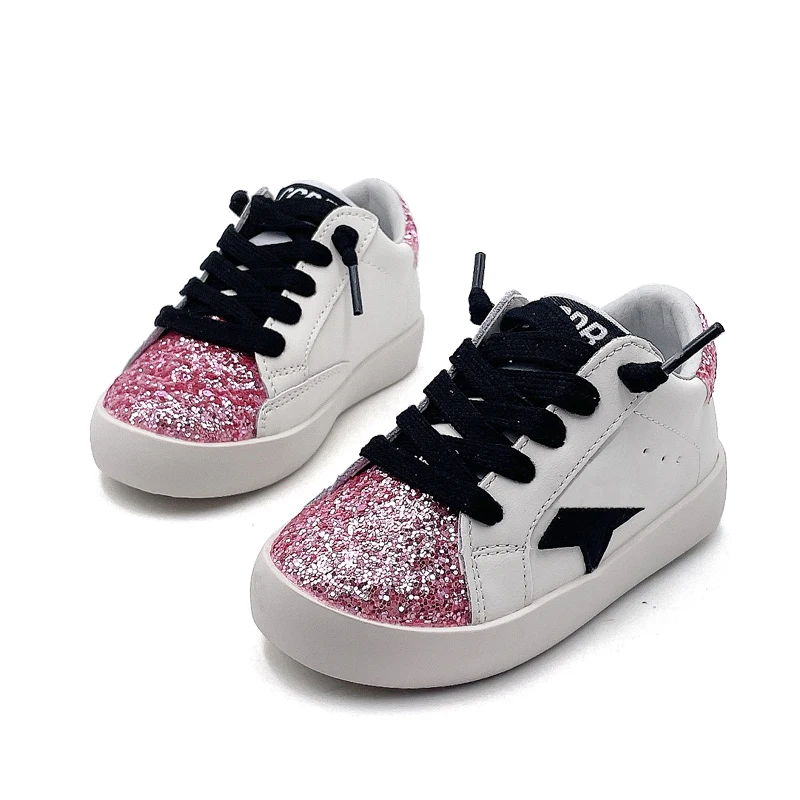 New Arrivals Lace up Babe Star Shoes Wholesale Pink Glitter School Children Casual Shoes Girls Fashion Soft Sneakers for Kids