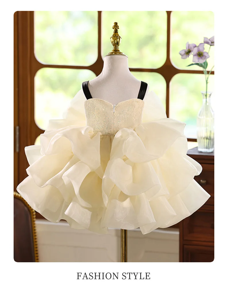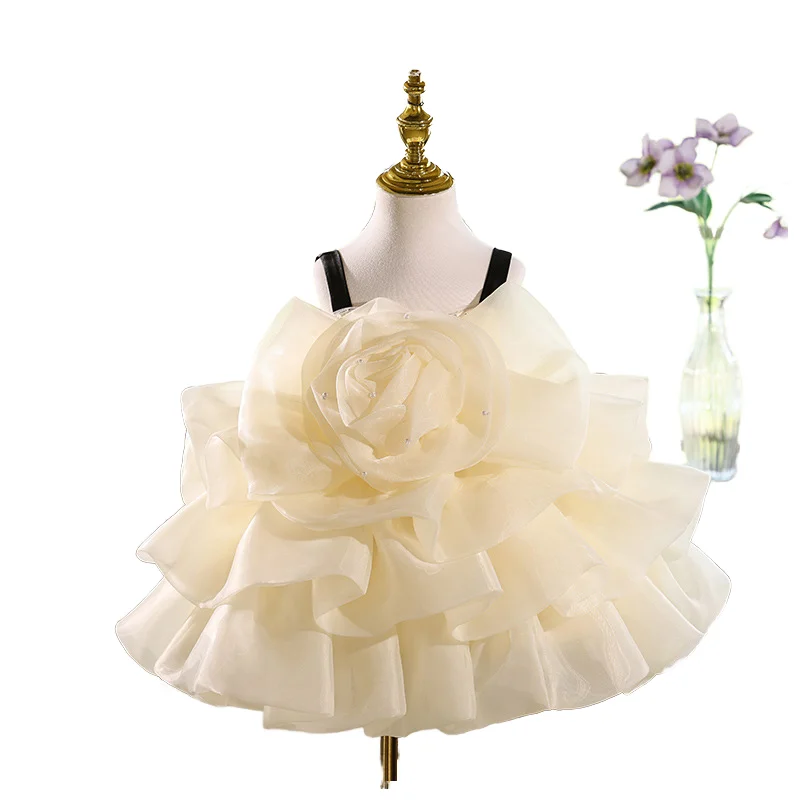 Summer Girl Champagne Flower Fluffy Princess Dress ODM Prom Gown with Solid Pattern Clothes for Kids