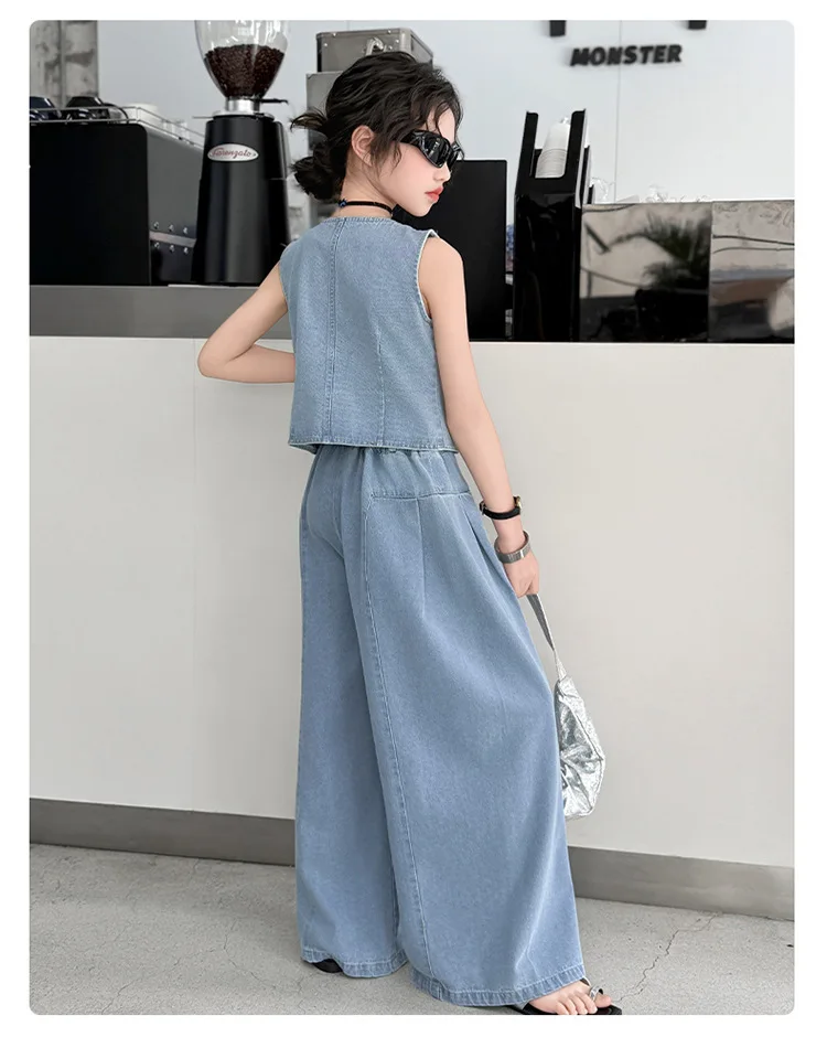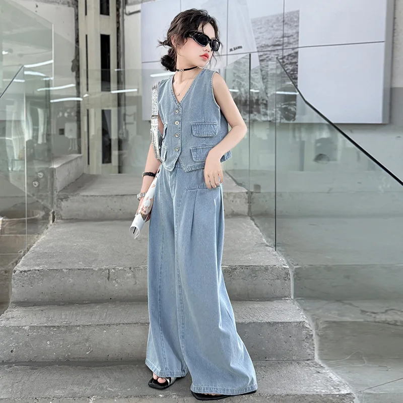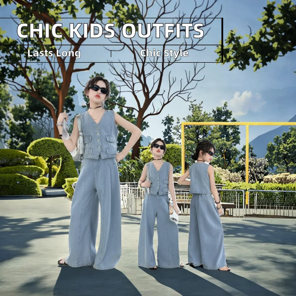 Fashionable Sweet Style Girls' Summer Outfits 2pcs Solid Color Denim Clothing Sets Woven Fabric Clothes with Front Logo for Kids