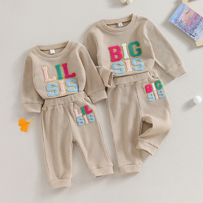 Autumn Winter New Kids Clothing for Baby Girls Waffle Set Letter Embroidered Hoodie Long Sleeve Pants Casual Sister Suit 2pcs