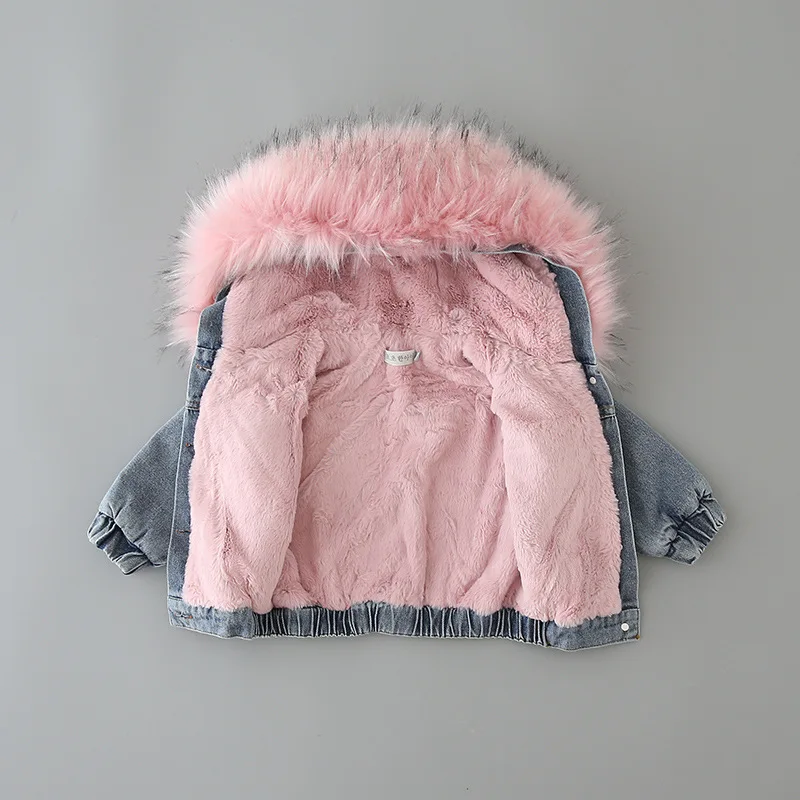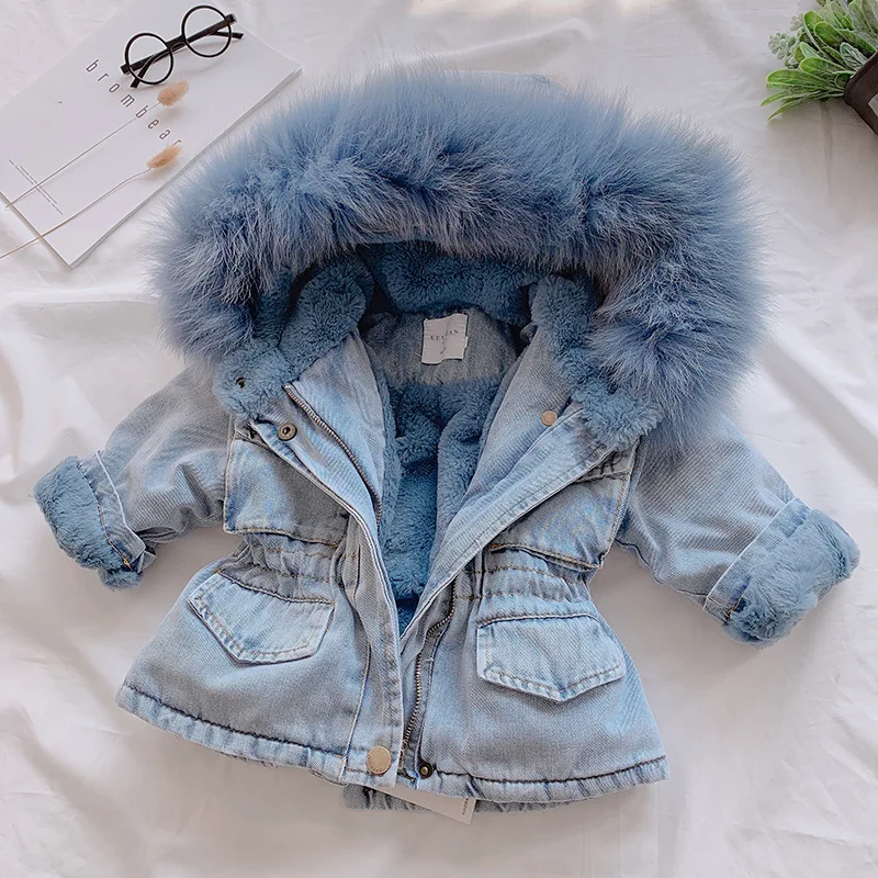 Customized Girls' Long Denim Jacket Autumn Winter Fleece-Lined Thickened Windbreaker Zipper Hooded Wool Collar Clothes for Kids