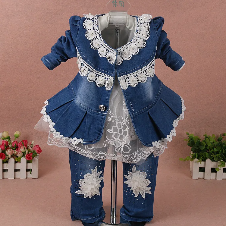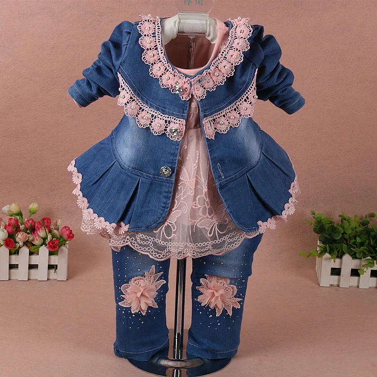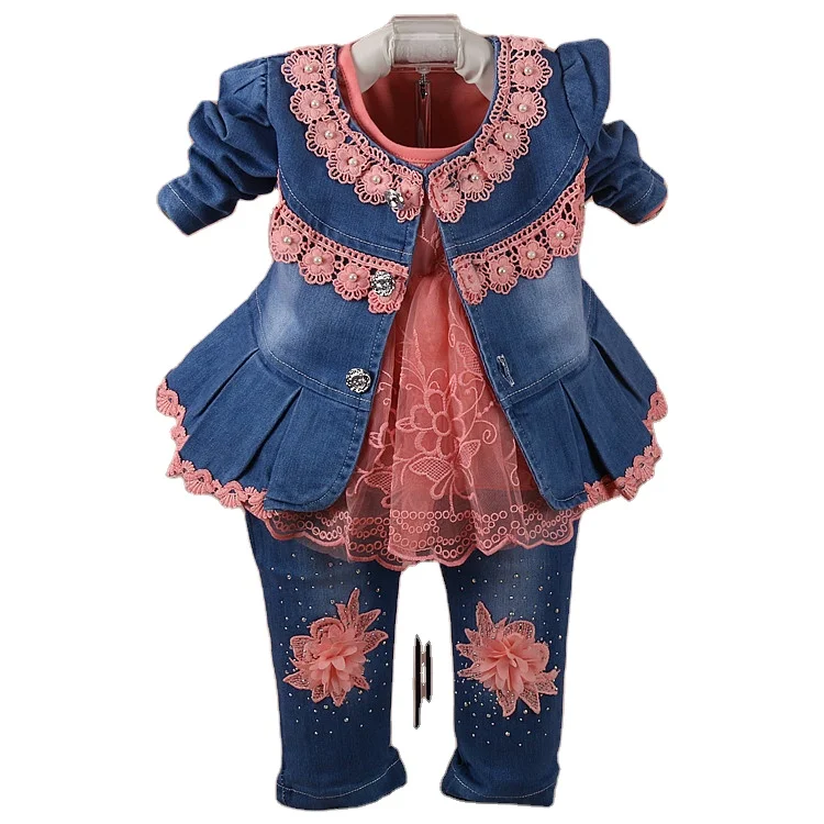 2019 New Design Boutique Fashionable Lace Flower Denim Three Pieces Set Kids Clothing Wholesale Kids Clothing in Hot Selling