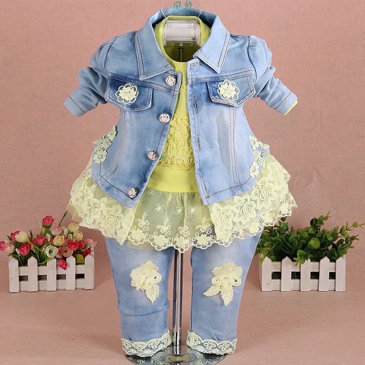 2019 Spring Autumn New Fashion Beautiful Flower Applique Lace Skirt Denim Set Girl Kids Clothing Children Clothes in Hot Selling