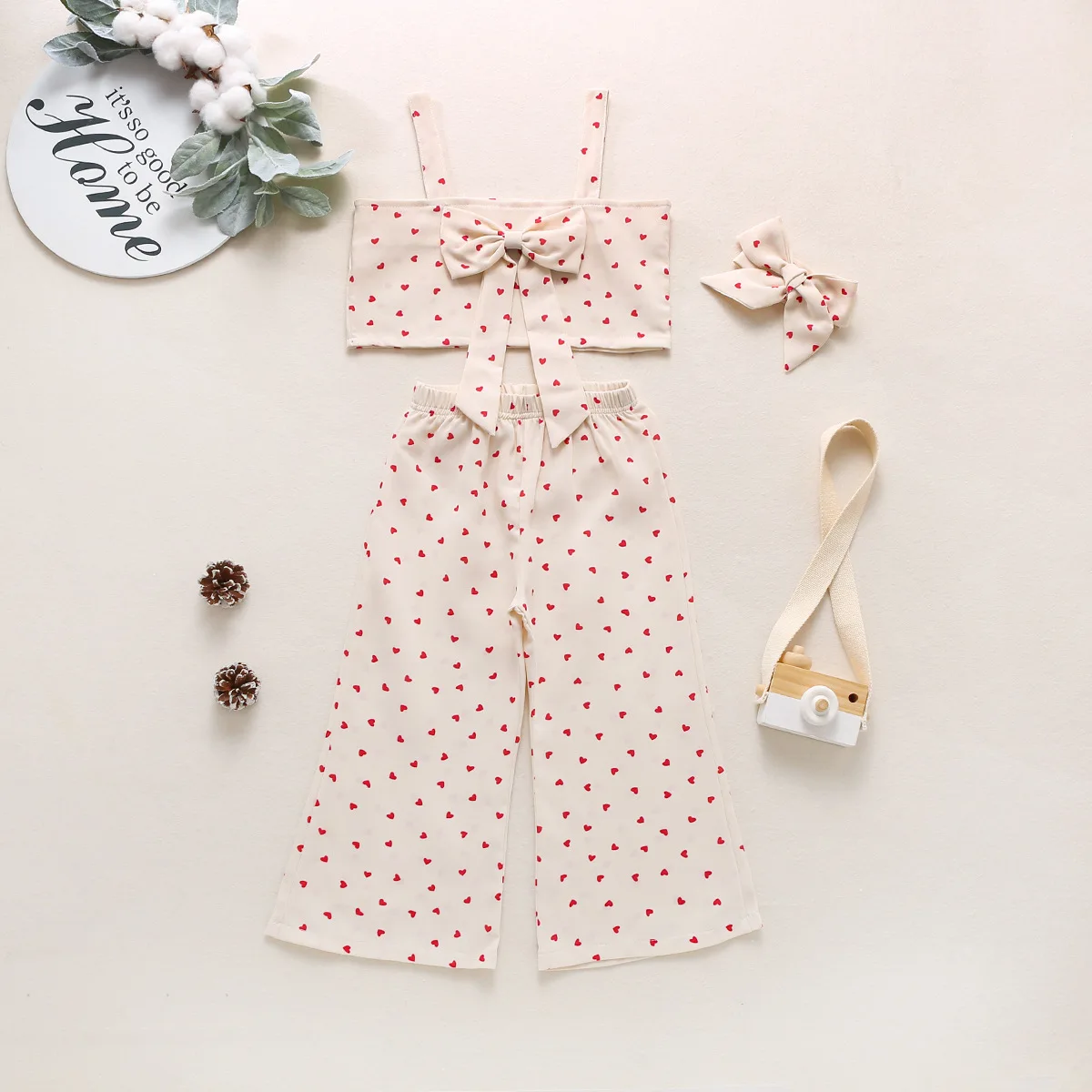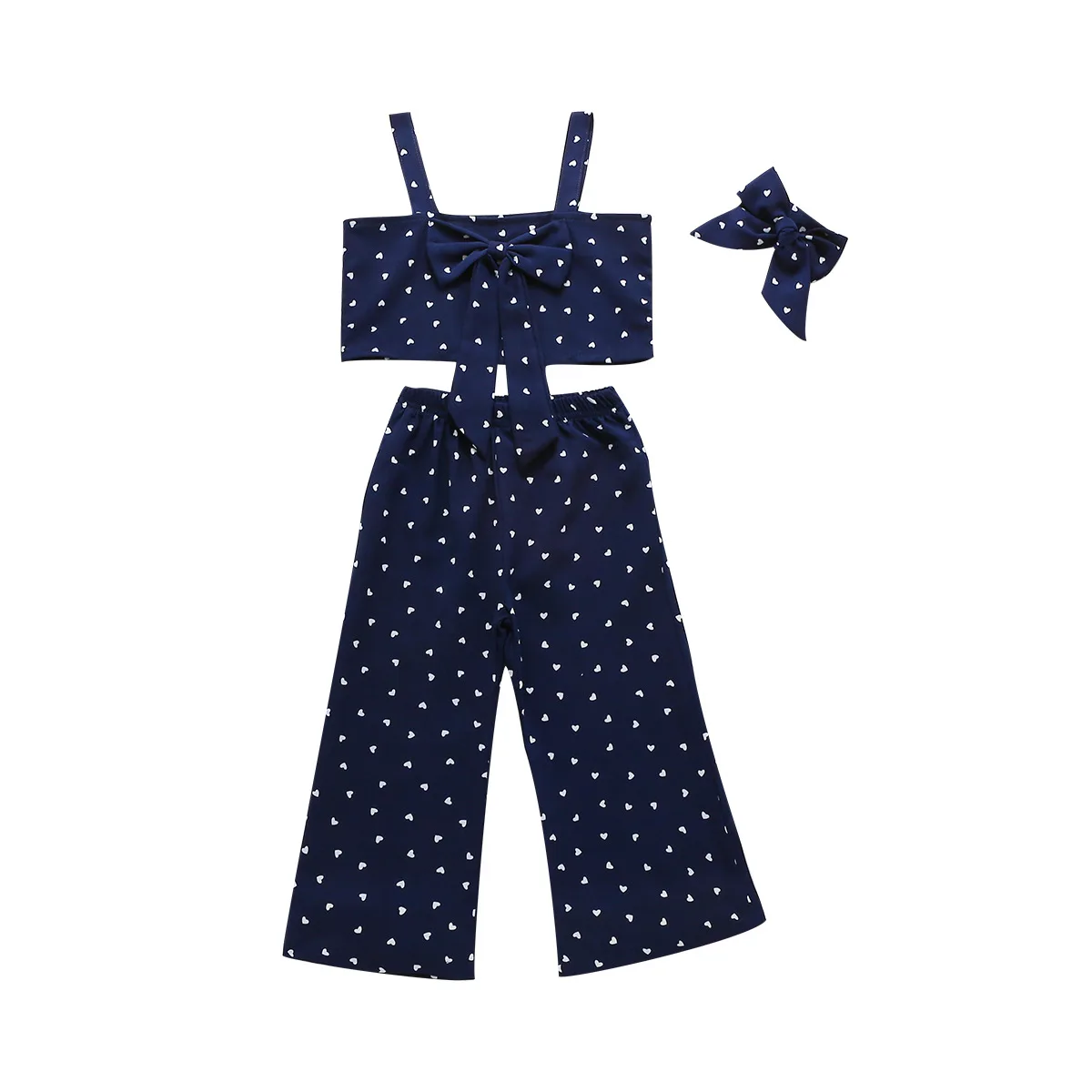 Girls Suit Suspender Kids Sleeveless Bow Top Heart Dot Wide Leg Pants Three Pieces Set Children Clothing Set