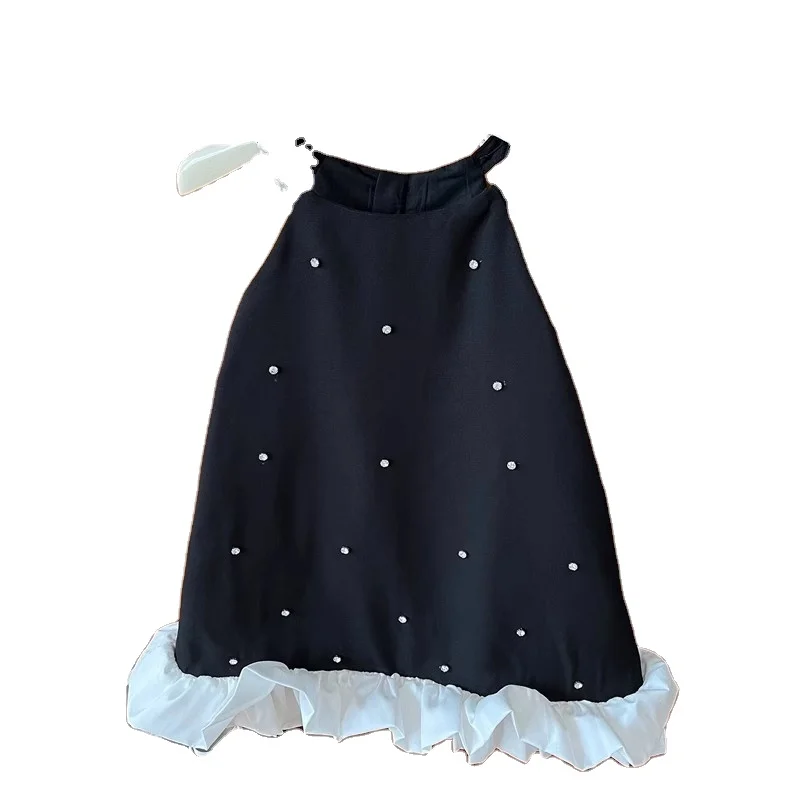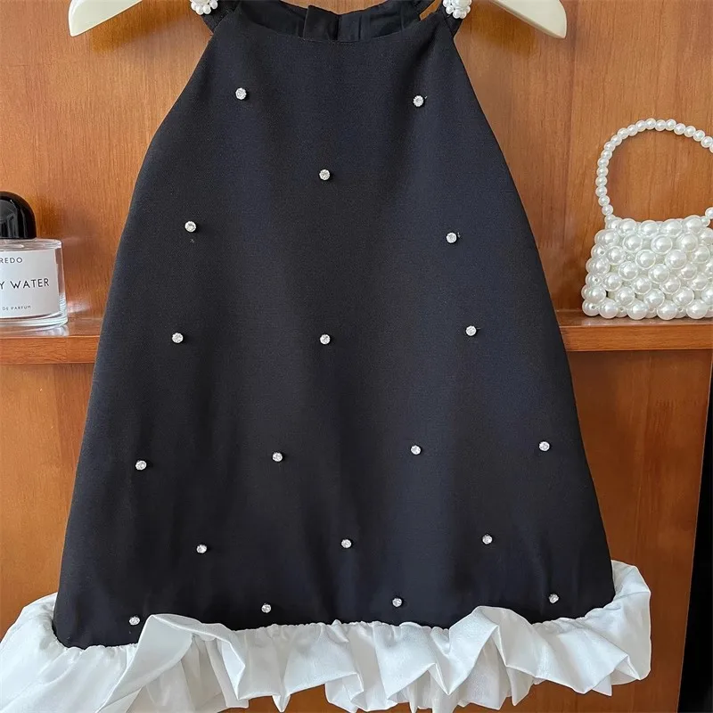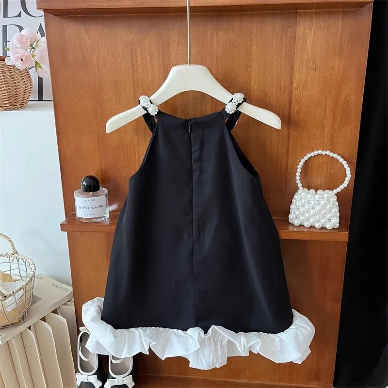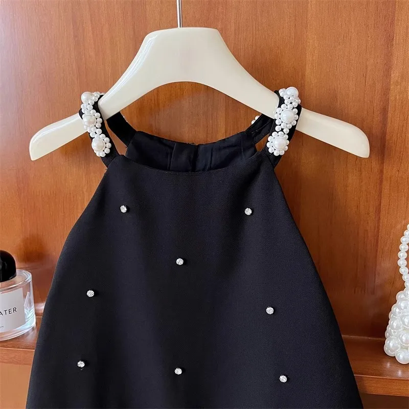 2026 New Black Girls Casual Clothing Flower Sleeveless Solid Color Pearls a Line Princess Dresses Children Summer Dress