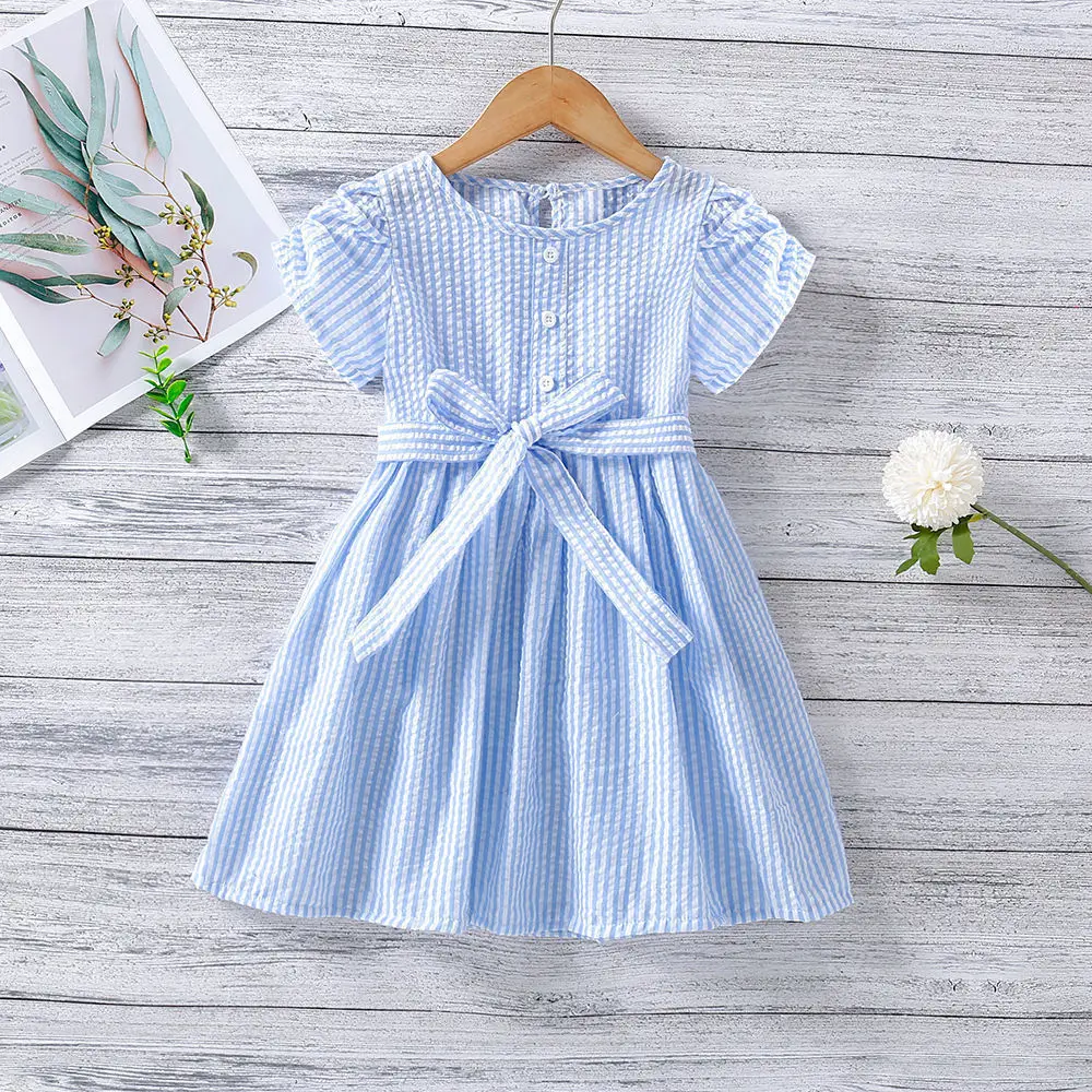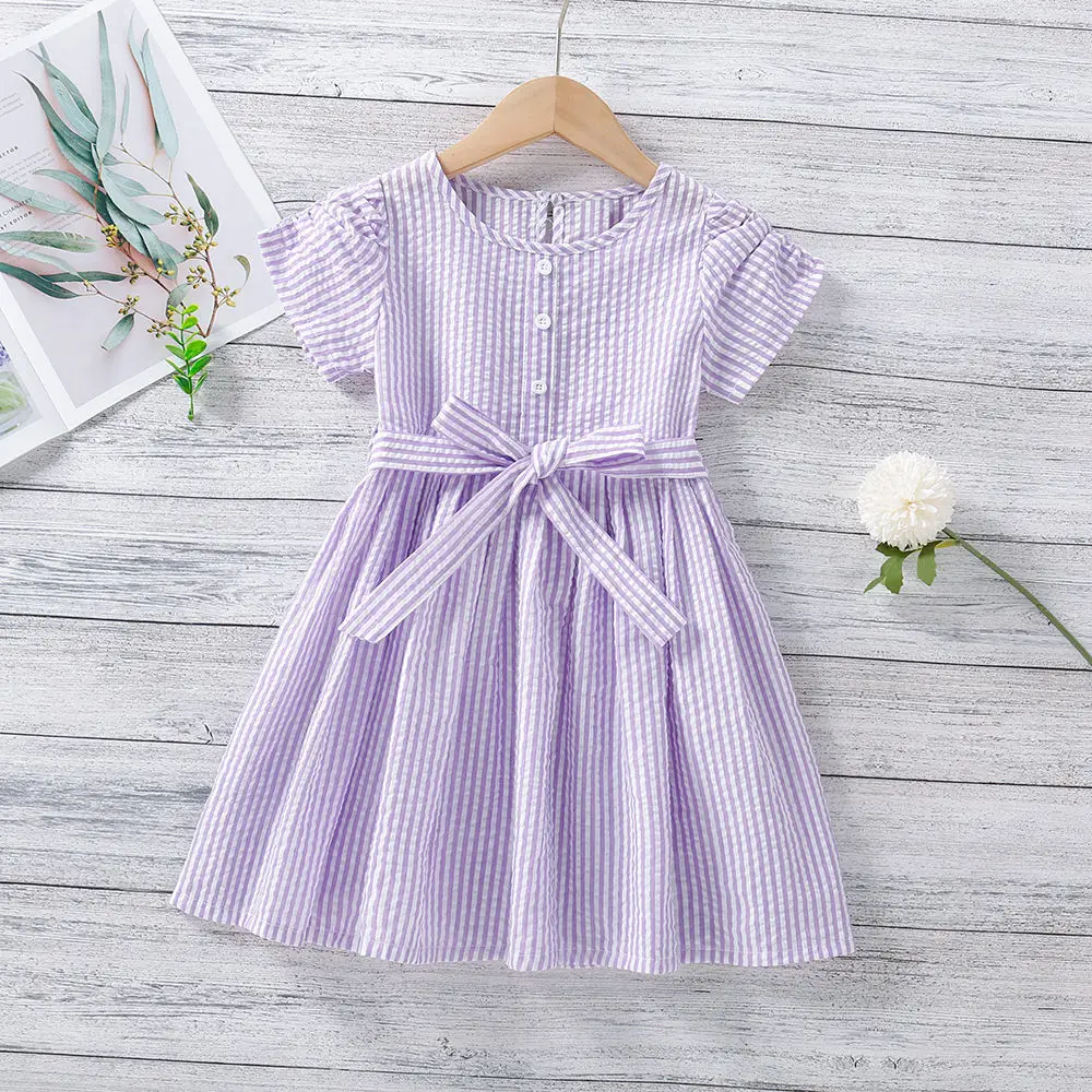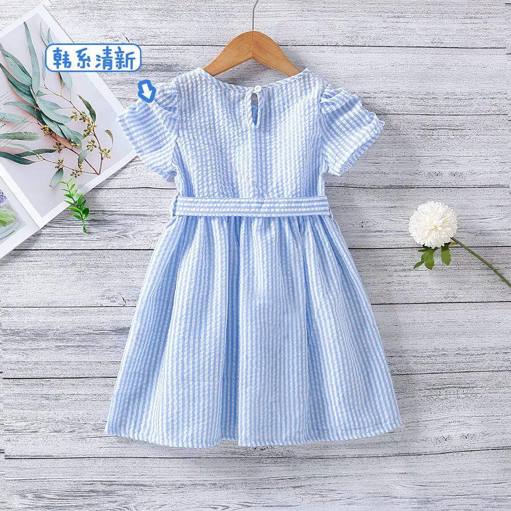 2021 Cotton Children Clothing Fashion Waist Princess Dress Summer O Neck Casual Short Sleeve Stripe Print a Line Girls Dresses