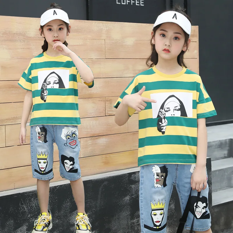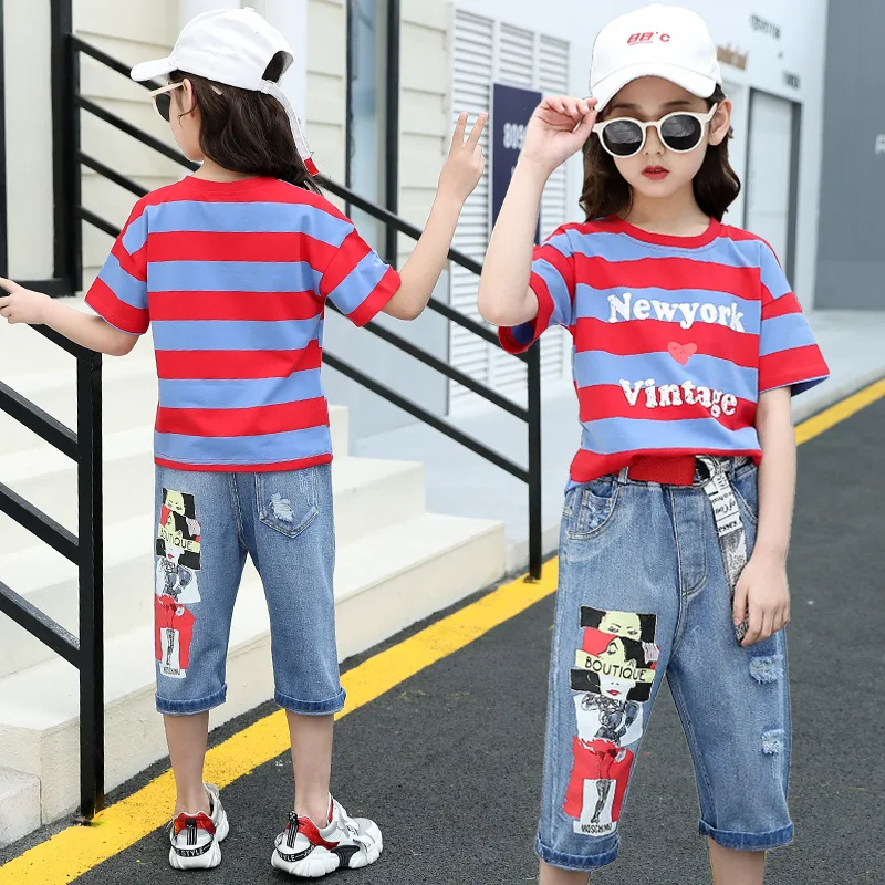 2021 Summer Flower Print Short Sleeve Shirt 2PCS Suit Jeans Shorts Beautiful Sports Outfit Kids Big Girls Clothes