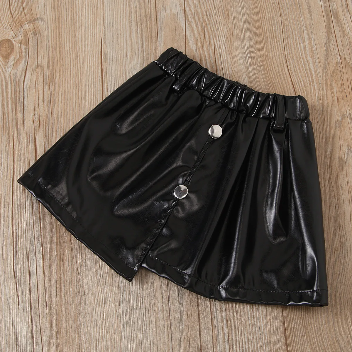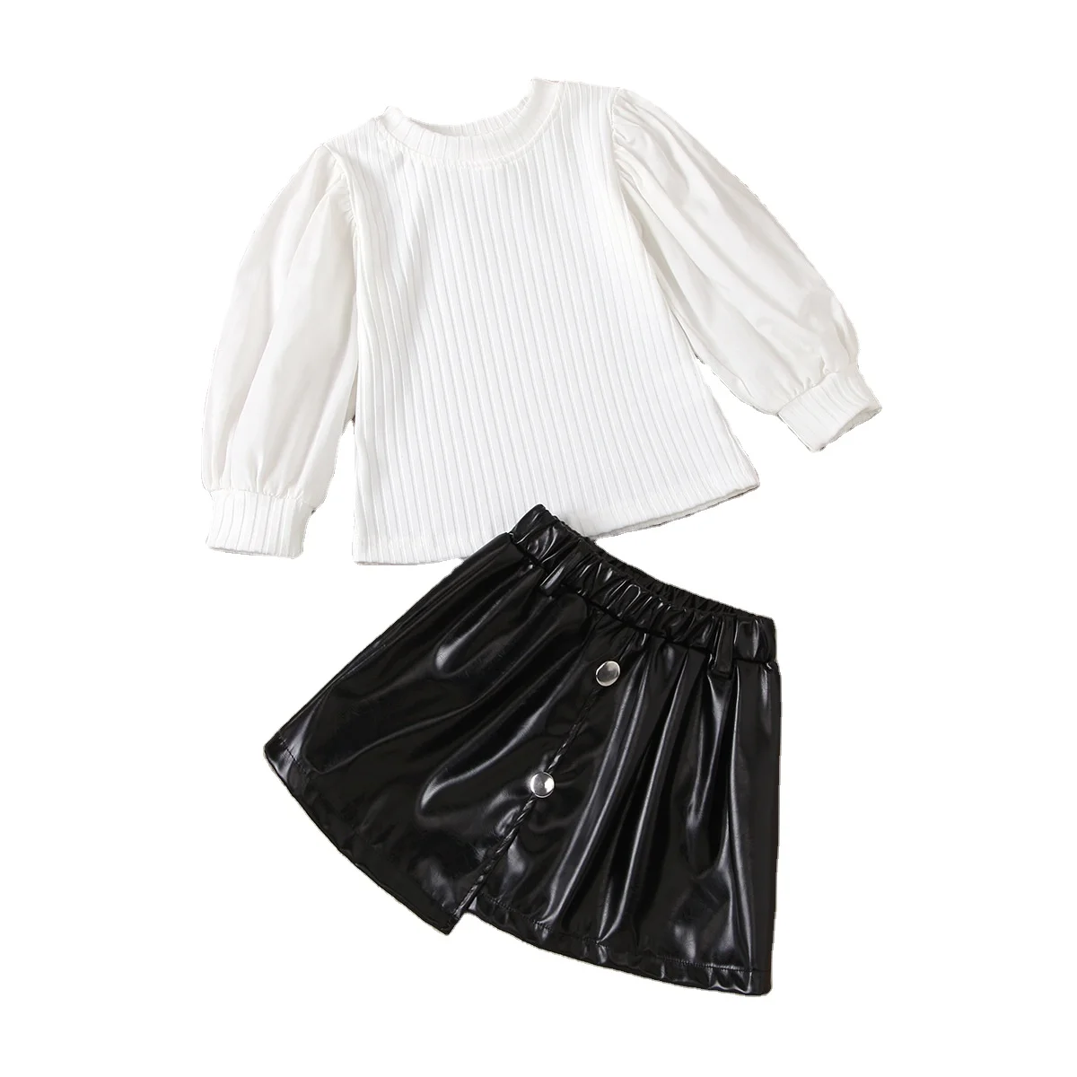 2021 Kids Baby Fashion Outfit Puff Sleeve Knitted Sweatshirt Tops Leather Skirt Children Clothing Girls Clothes Set
