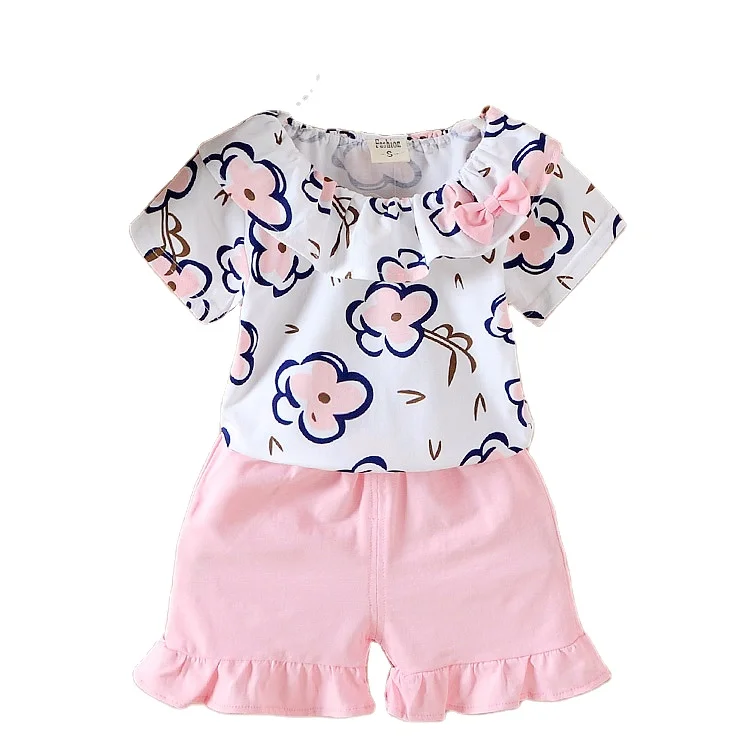 Fashion Lovely Comfortable Flounces Floral Print Short Sleeve Top Ruffled Shorts 2019 Kids Clothing Children Boutique Clothes
