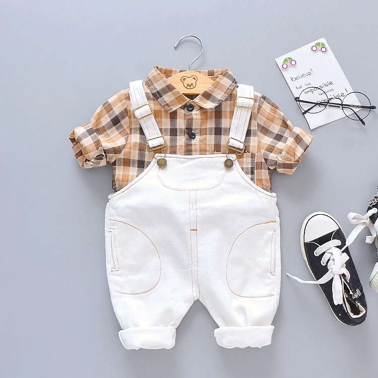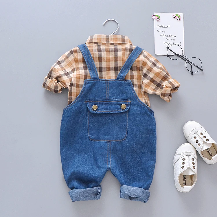 Spring Autumn Fashion Comfortable Checked Turndown Collar Shirt Denim Pants Boutique Cotton Children Clothes Kids Clothes Boys