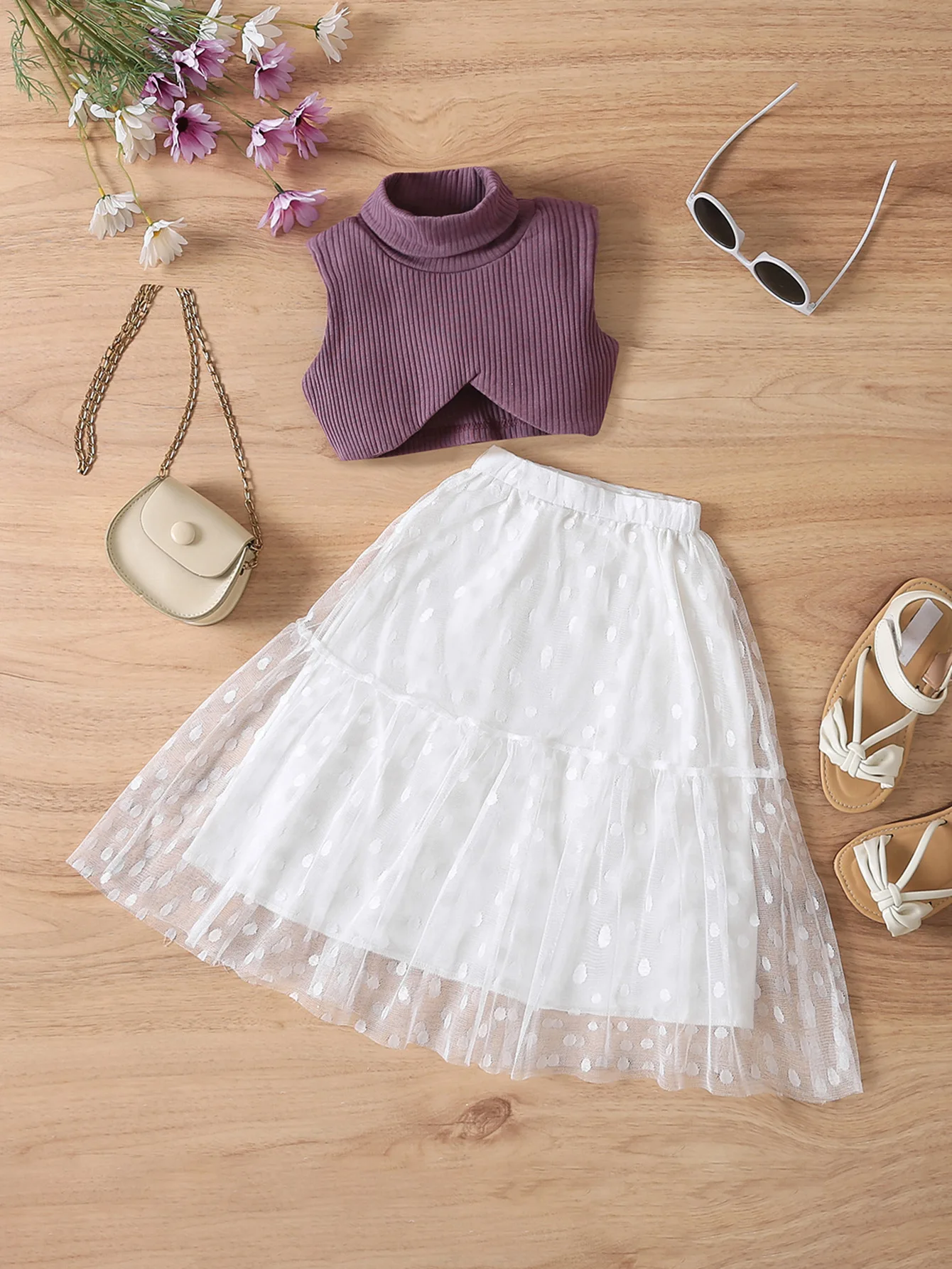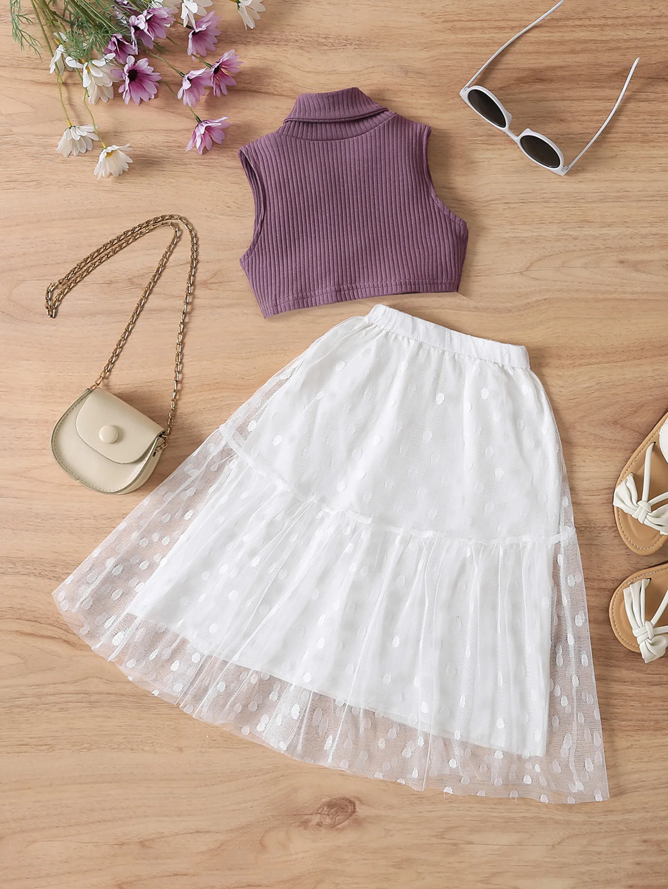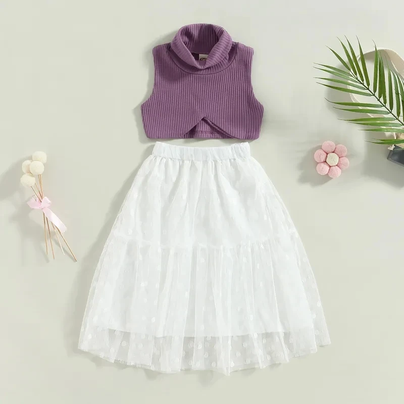 2023 Fashion Kids Girls Dress Suit Sleeveless Turtleneck Vest with Dots Tulle Lace Skirt 2Pcs Sets Kids Clothing Summer