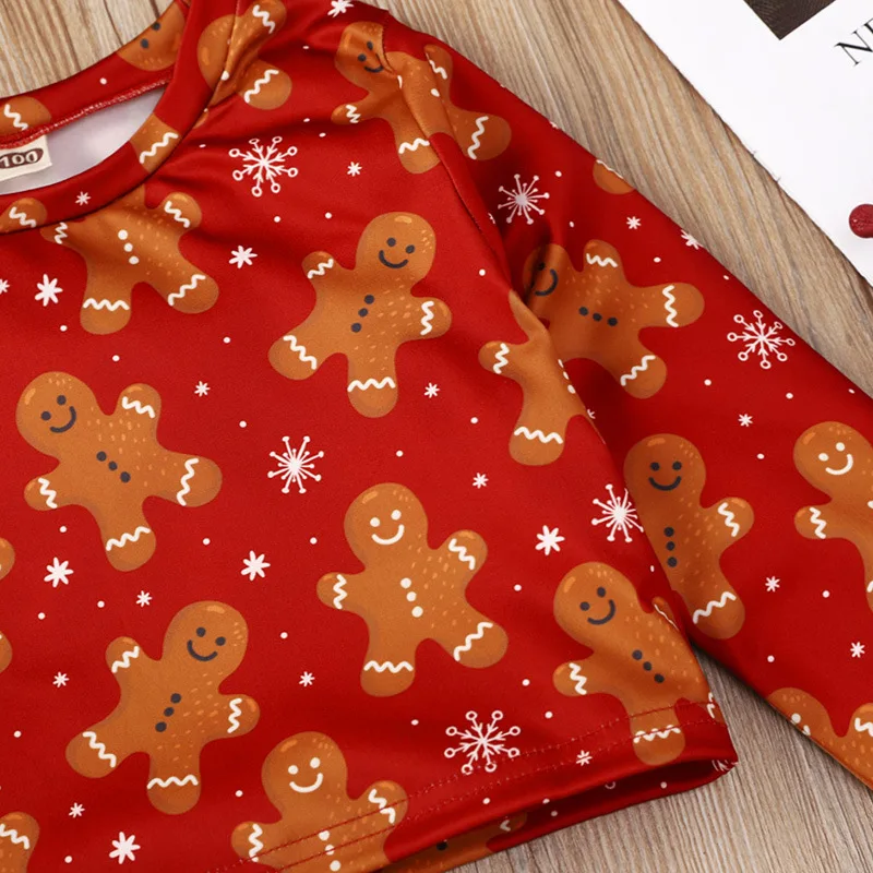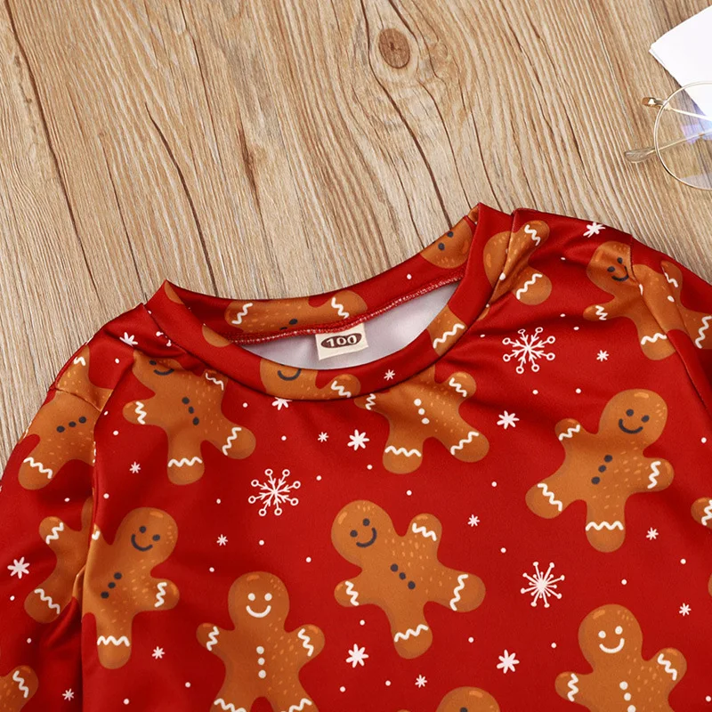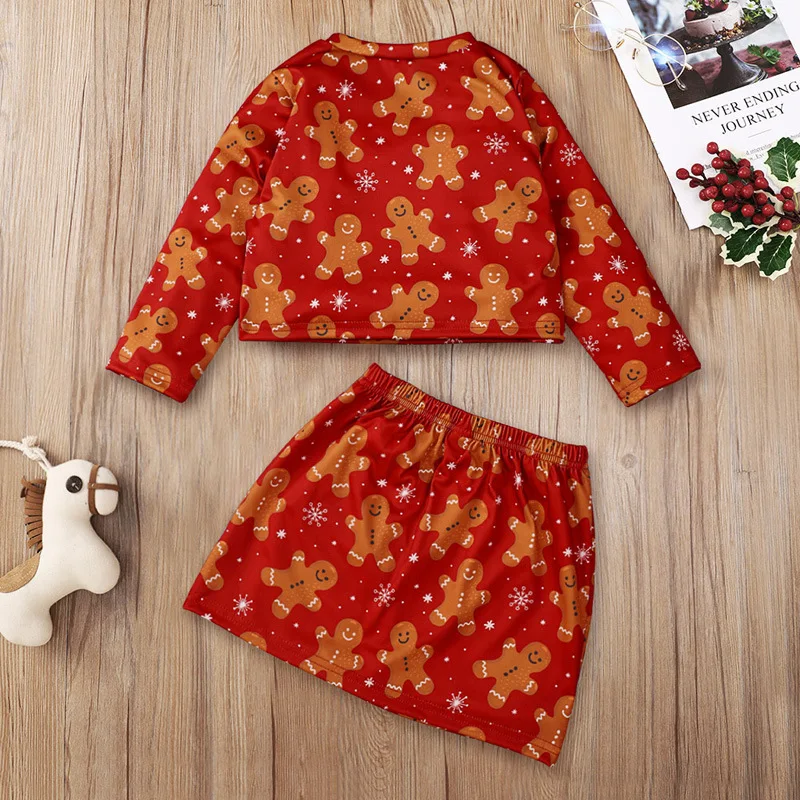 2021 Red Solid Long Sleeve Cartoon Print Blouse Sweet Bow Skirt Two Pieces Girls Christmas Clothing Set for Autumn