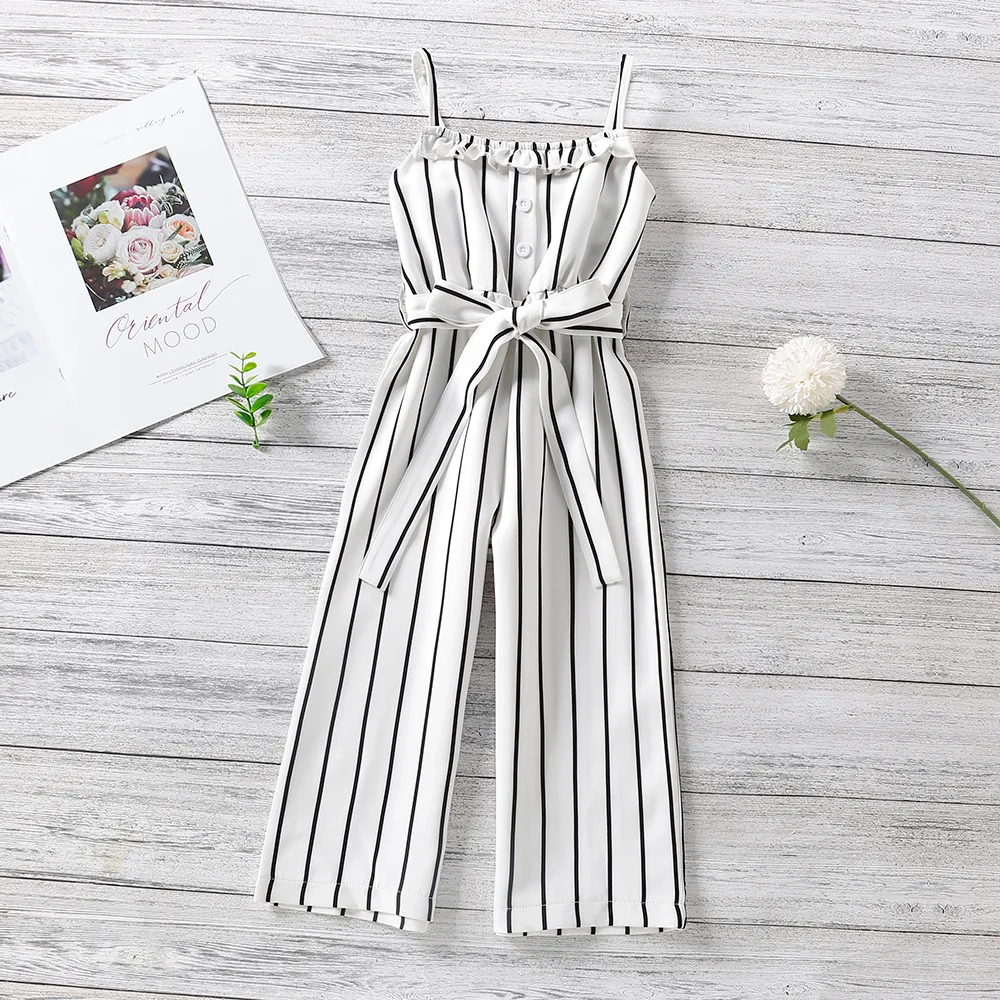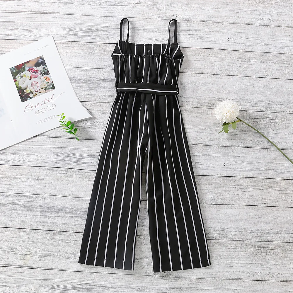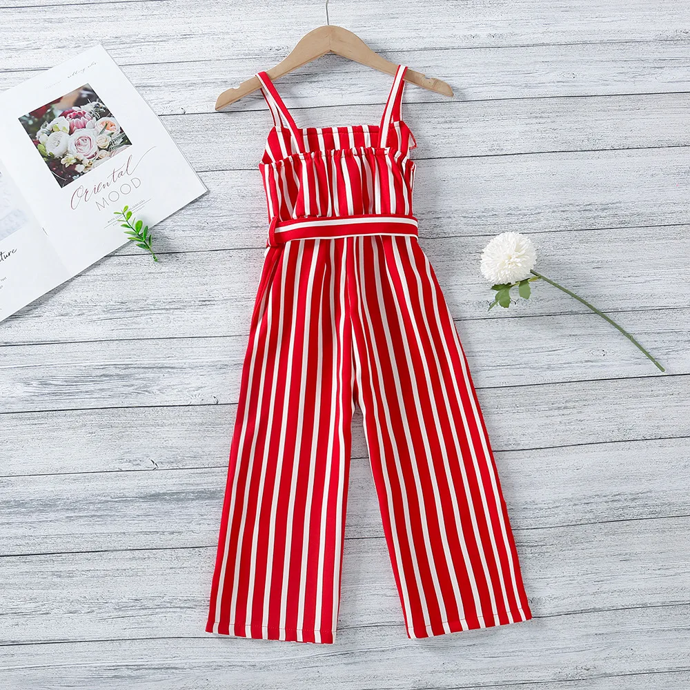 2021 Hot Selling 3 Color Kids Summer Bodysuit Trousers Striped Print Fashion Strap Flounce Sleeveless Casual Jumpsuit for Girls