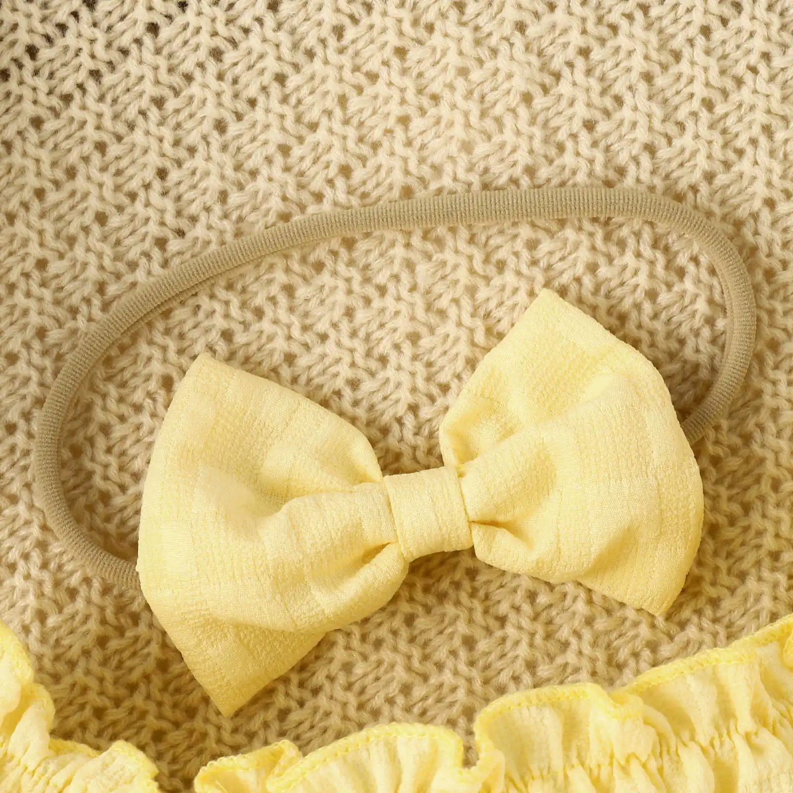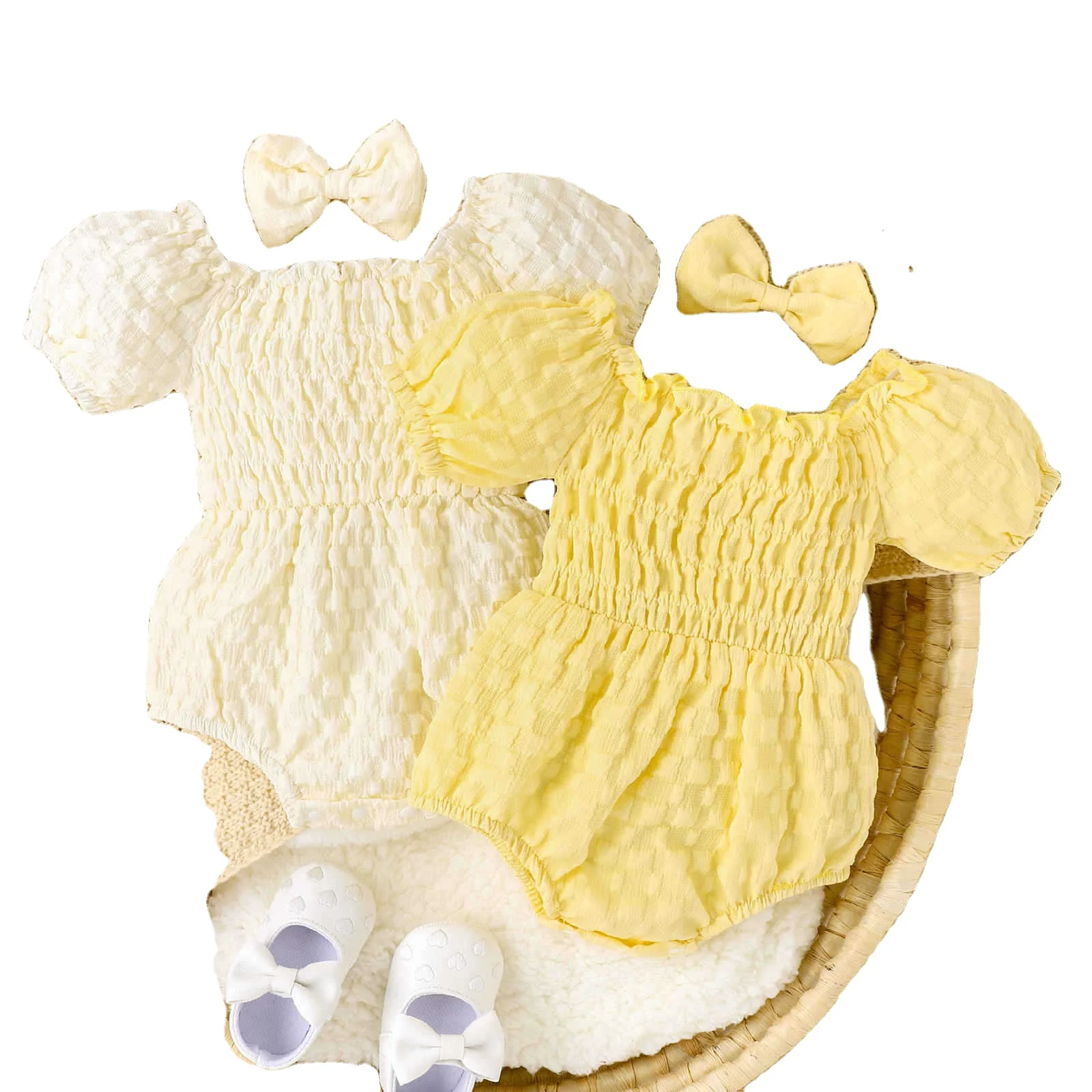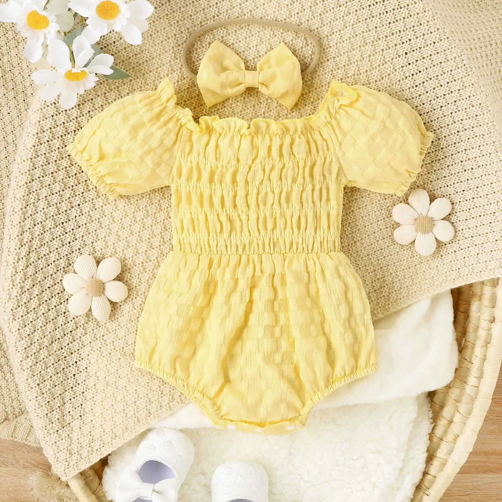 2023 2pcs Clothes Sets Off Shoulder Short Sleeve Solid Ruched Infant Jumpsuits with Bowknot Headband Baby Girls Cute Romper