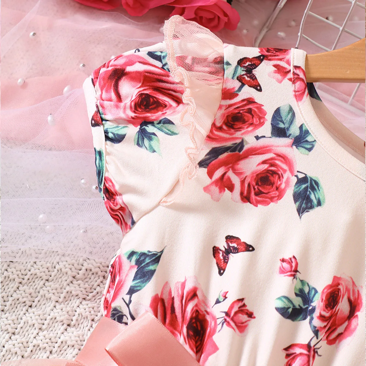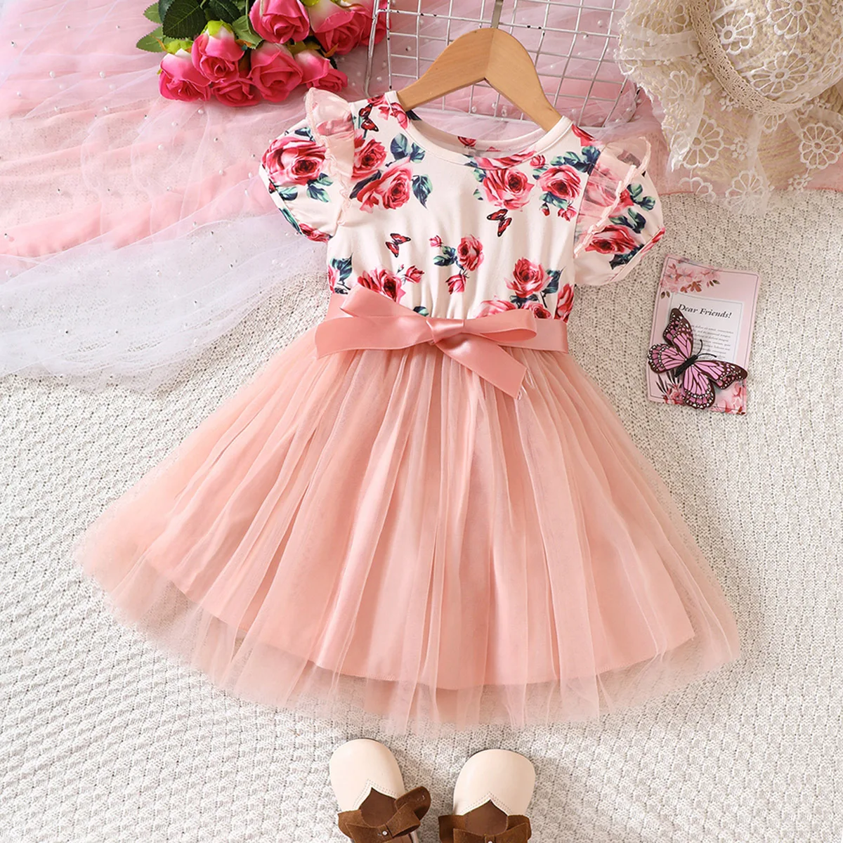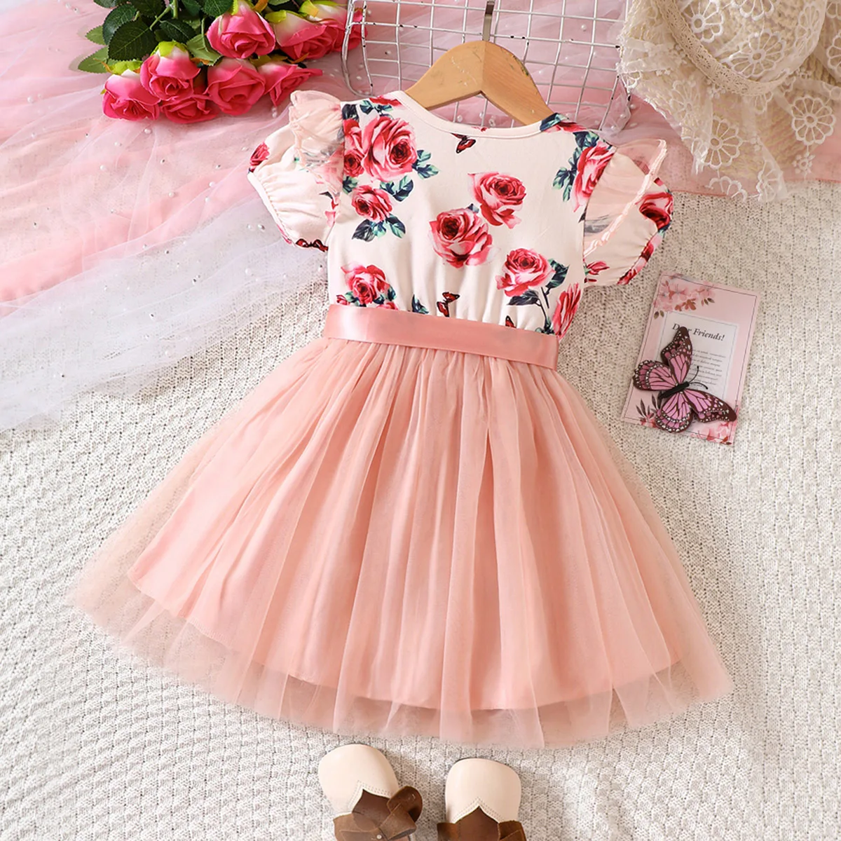 2023 Summer Casual Kids Girls Clothes Puff Sleeve Round Neck Floral Patchwork Mesh Patchwork Dresses Toddler Tulle Dress