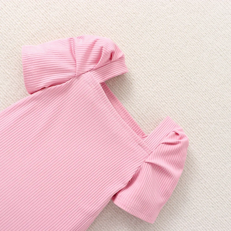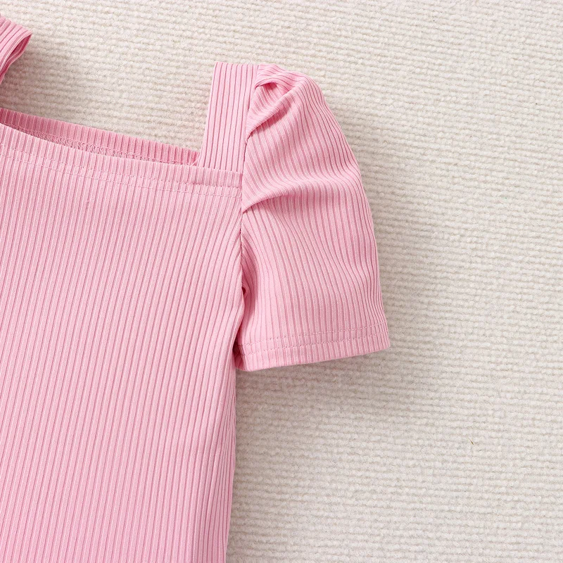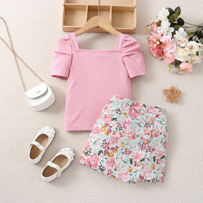 2023 Hot Sale Children Girls Clothes Wholesale Short Sleeve Pink Knit T Shirt Floral a Line Skirt 2Pcs Kids Summer Clothing Sets