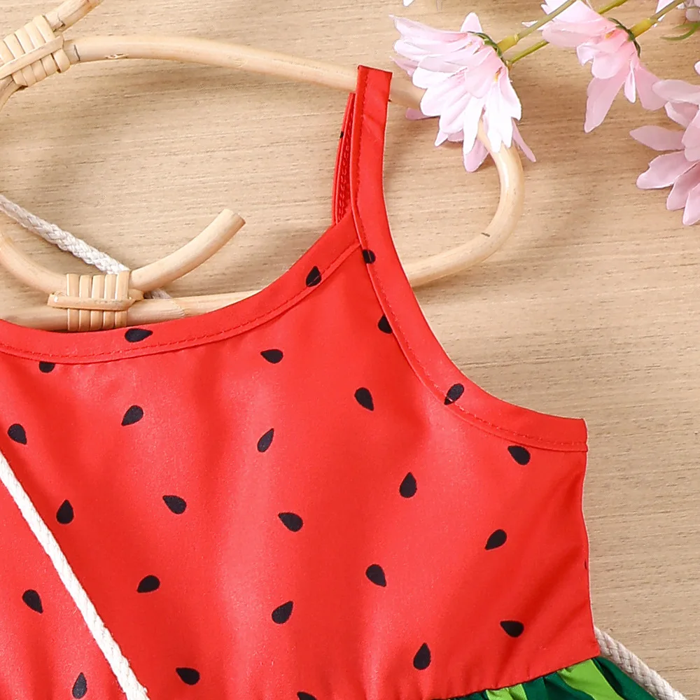 2026 High Quality Summer Korean Sleeveless Watermelon Prints Beach Holiday Party Toddler Costume Kids Dress with Bag