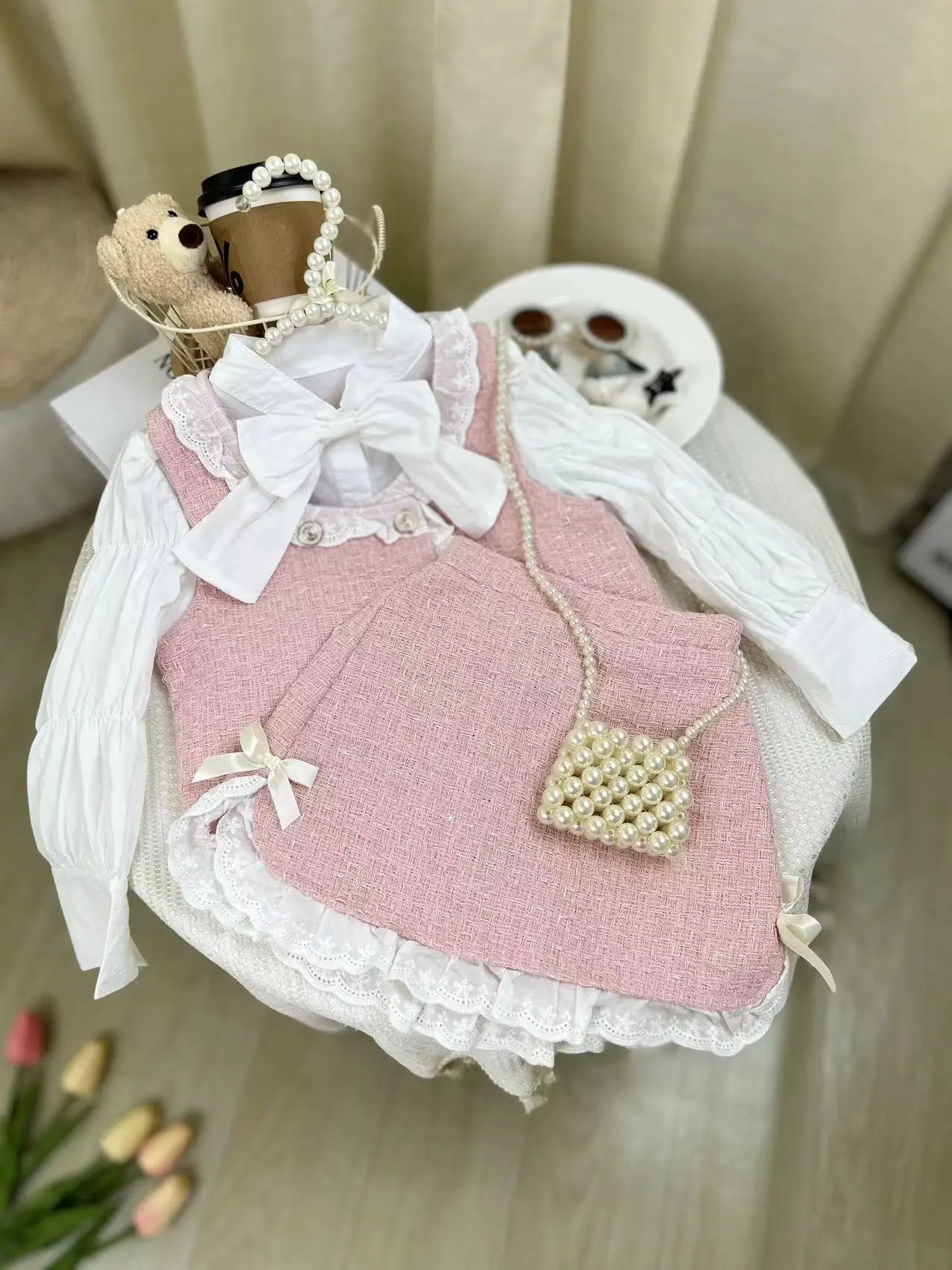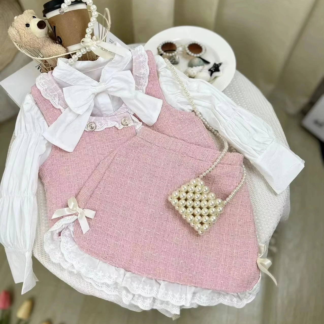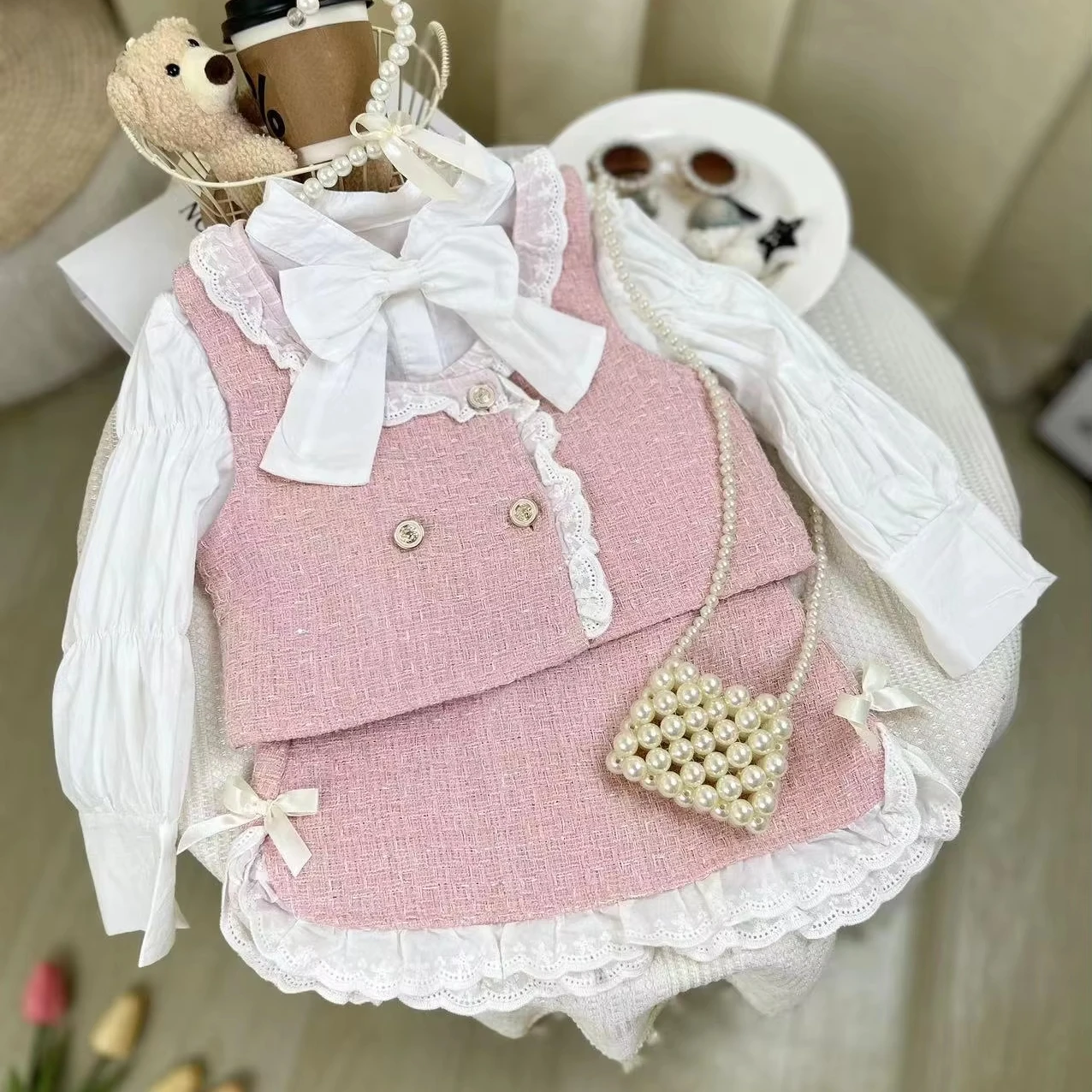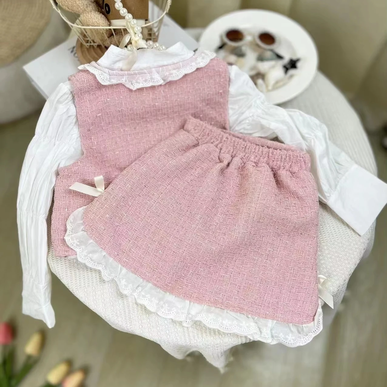 2026 Spring Autumn Children Girls Boutique Clothes Solid Color Long Sleeve White Shirt Lace Vest Skirt 3Pcs Kids Set Clothing