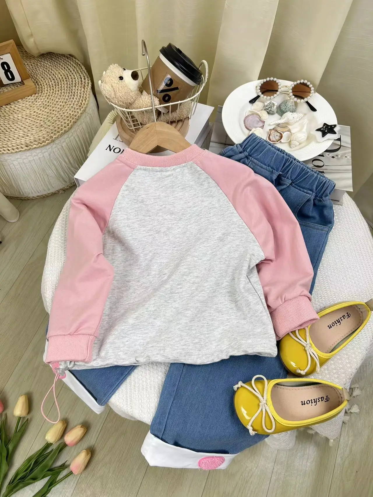 Kids Wear Wholesale 2026 Spring Autumn Toddler Girl Clothing Patchwork Long Sleeve T Shirt Denim Pants 2Pcs Kids Fashion Clothes
