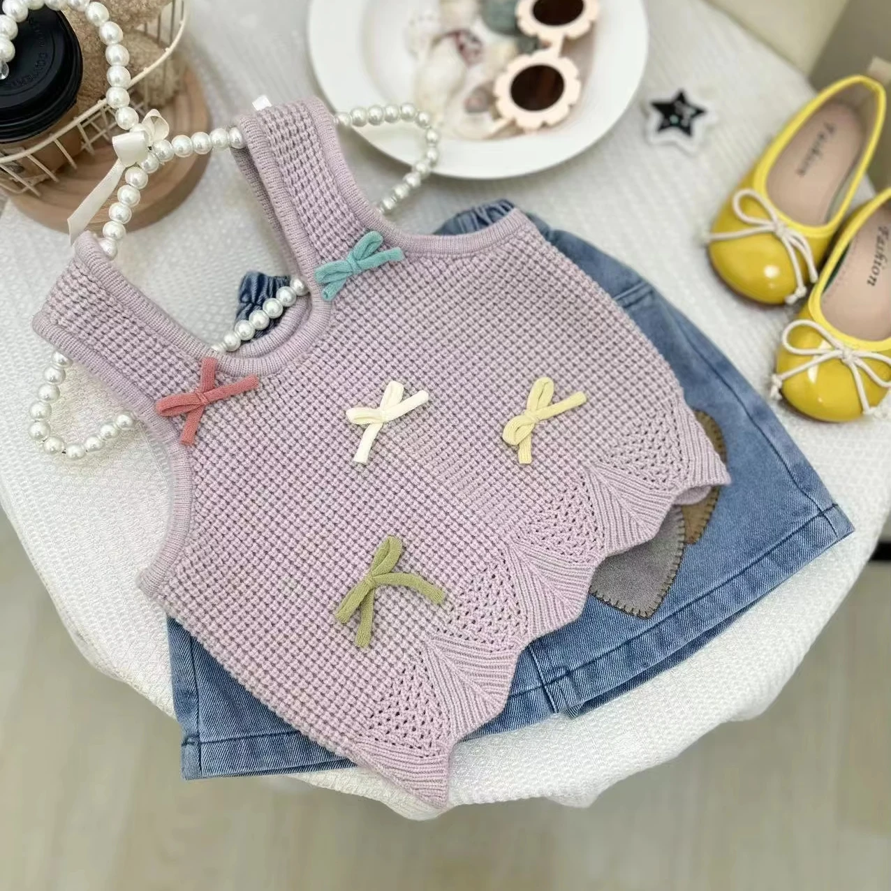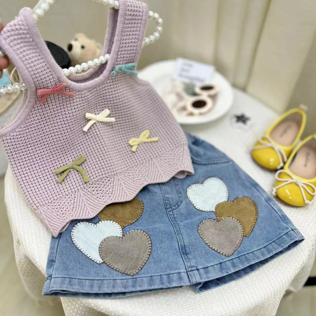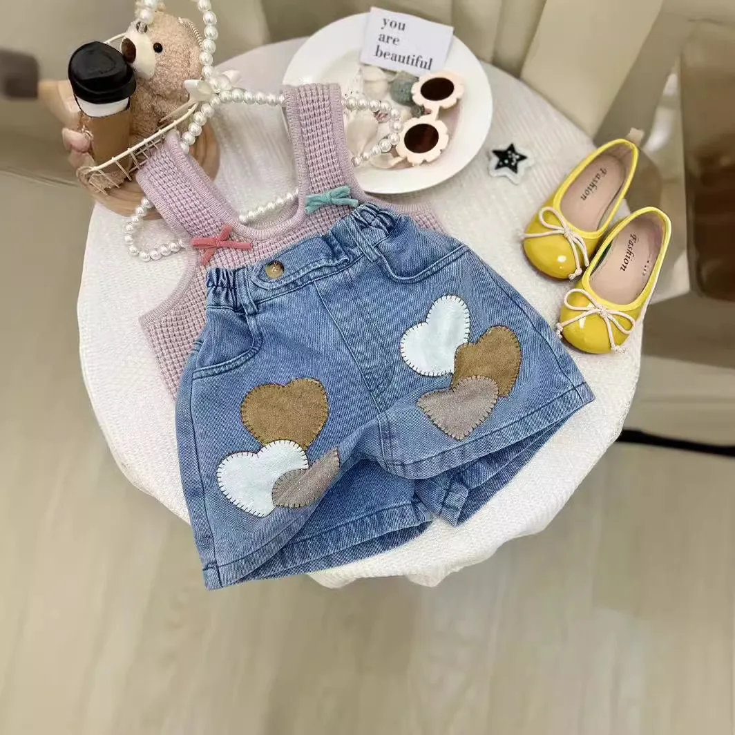 2026 Summer Boutique Kids Clothing Set Knitted Bow Vest Love Heart Print Denim Skirt Two Piece Child Girl Clothes