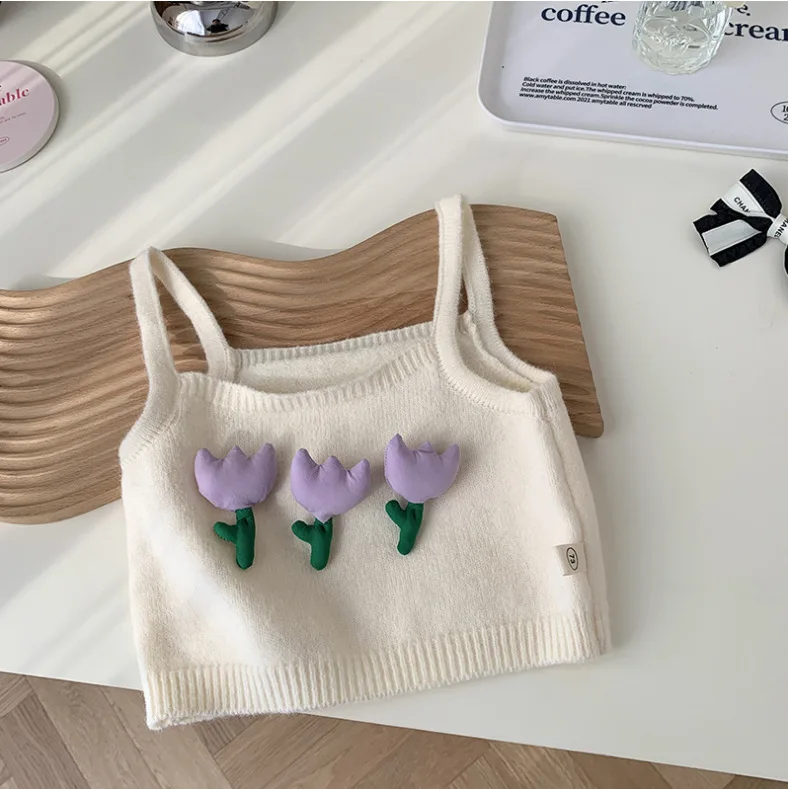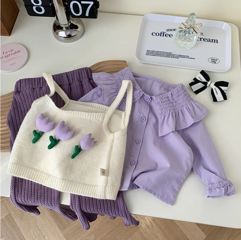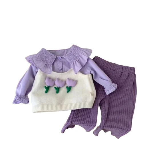 2026 Spring Autumn Wholesale Kids Girl Clothes Set Long Sleeve Shirt Flower Sweater Vest Flare Pants 3pcs Child Outfit