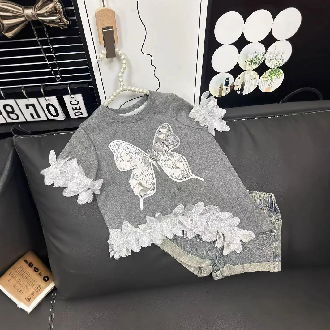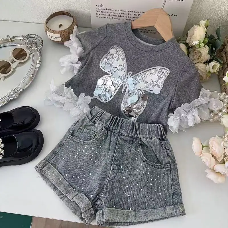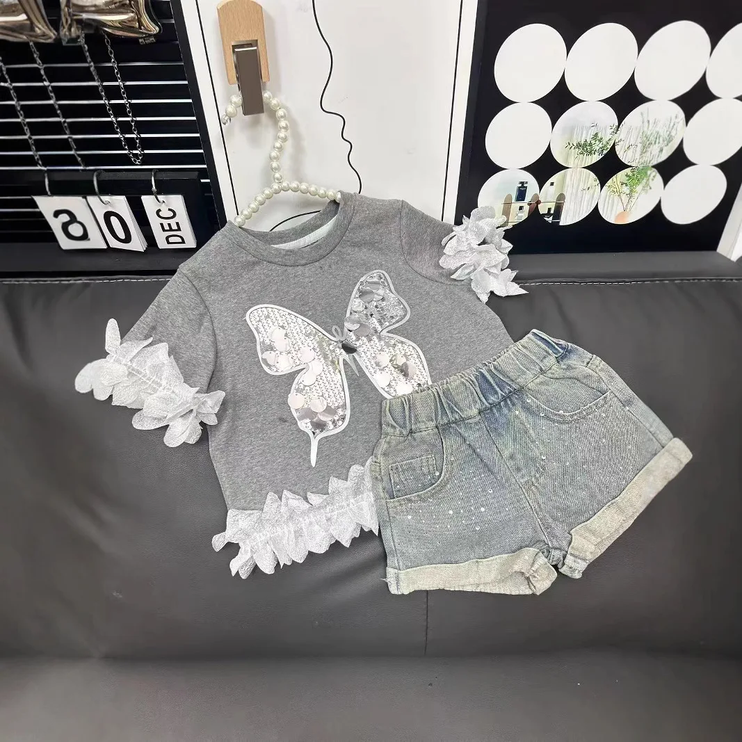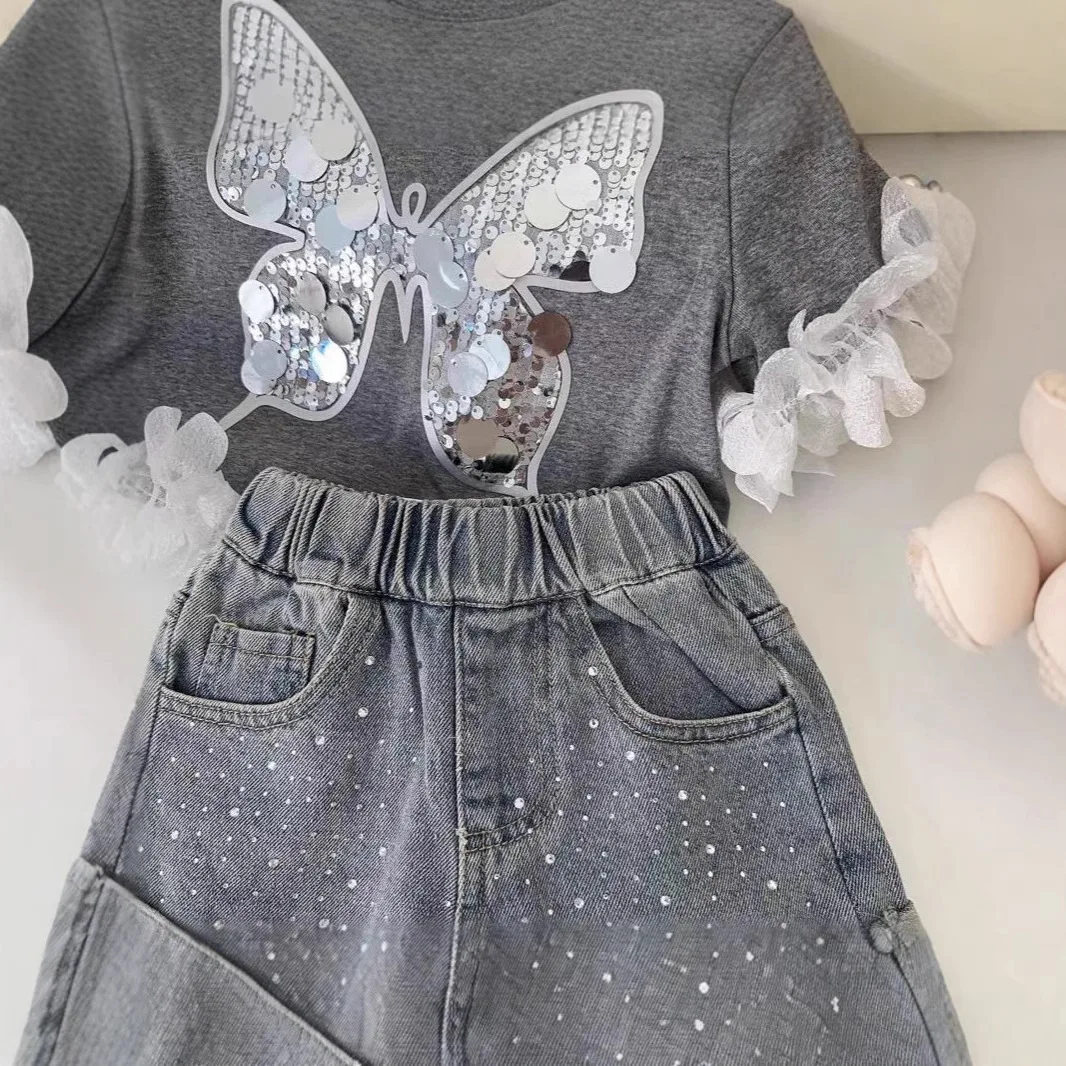 2026 New Arrival Korean Children Clothing Butterfly Sequined T Shirt Denim Shorts Two Piece Sets Kids Girls Summer Clothes