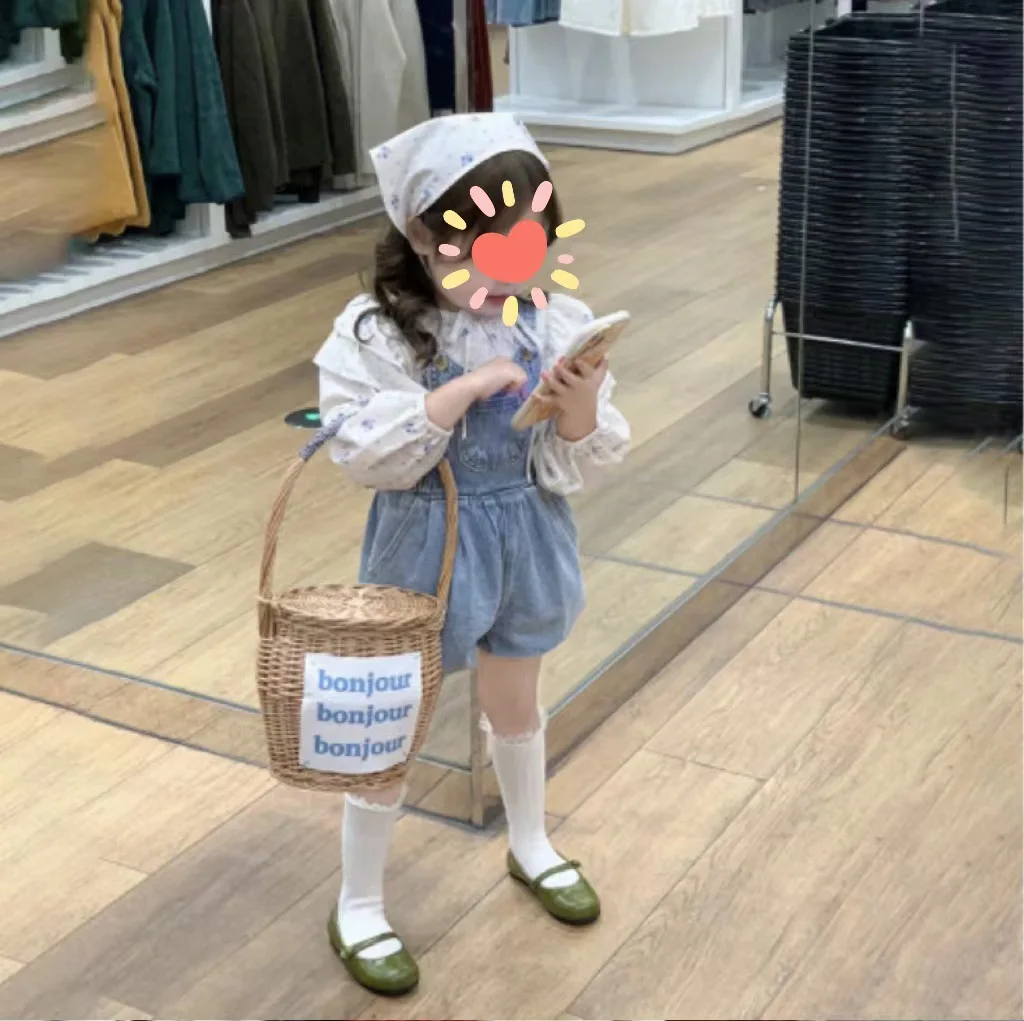 2026 Korean-Style Two-Piece Set Girls' Casual Fashionable Long-Sleeved Floral Shirt Denim Shorts Clothing for Children 7 Years