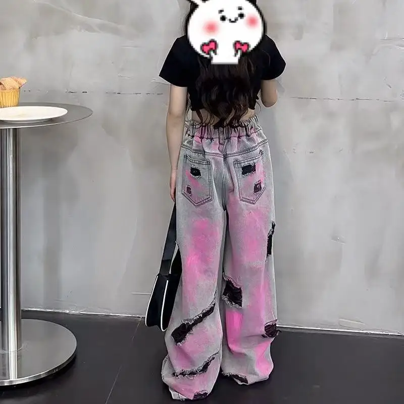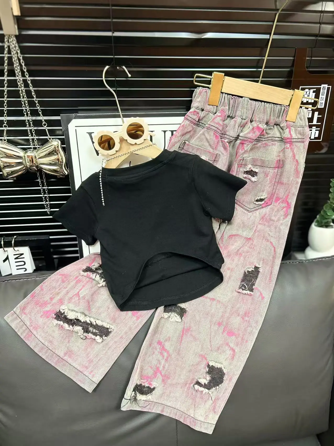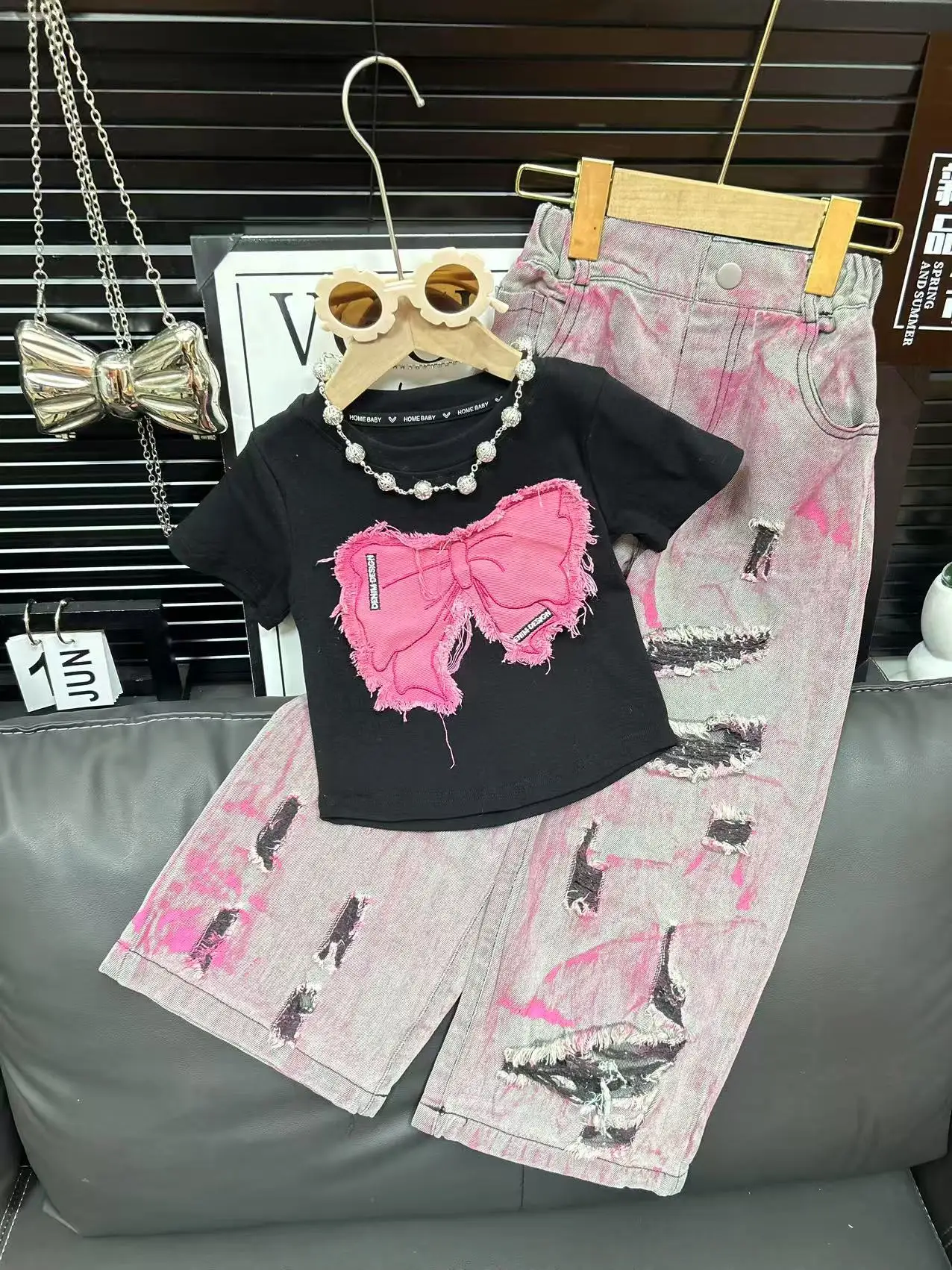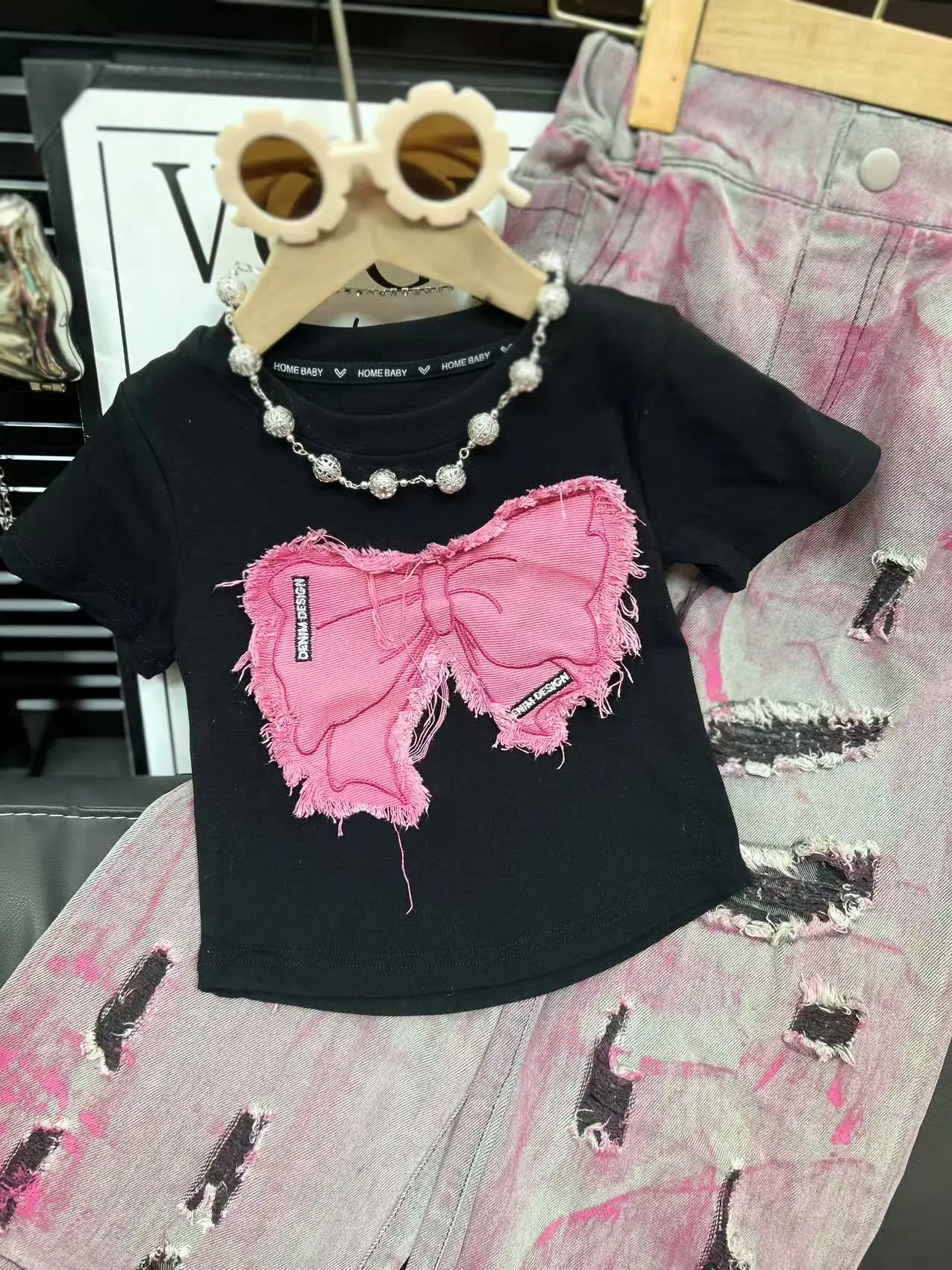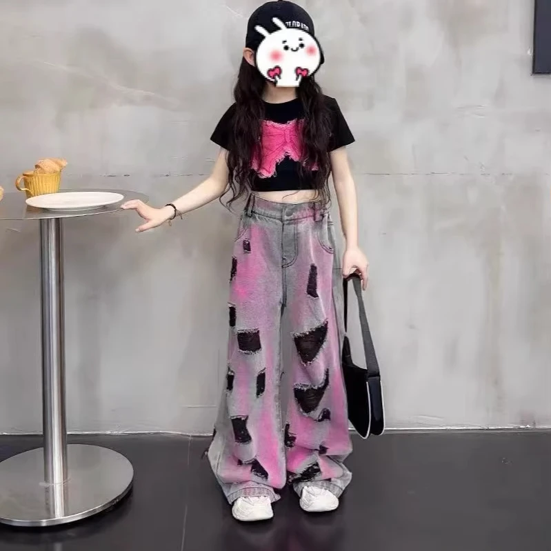 2026 New Arrival Children Clothes Set Summer Embroidered butterfly Short-sleeved T Shirt Trendy Ripped Jeans 2Pcs Girls Clothing