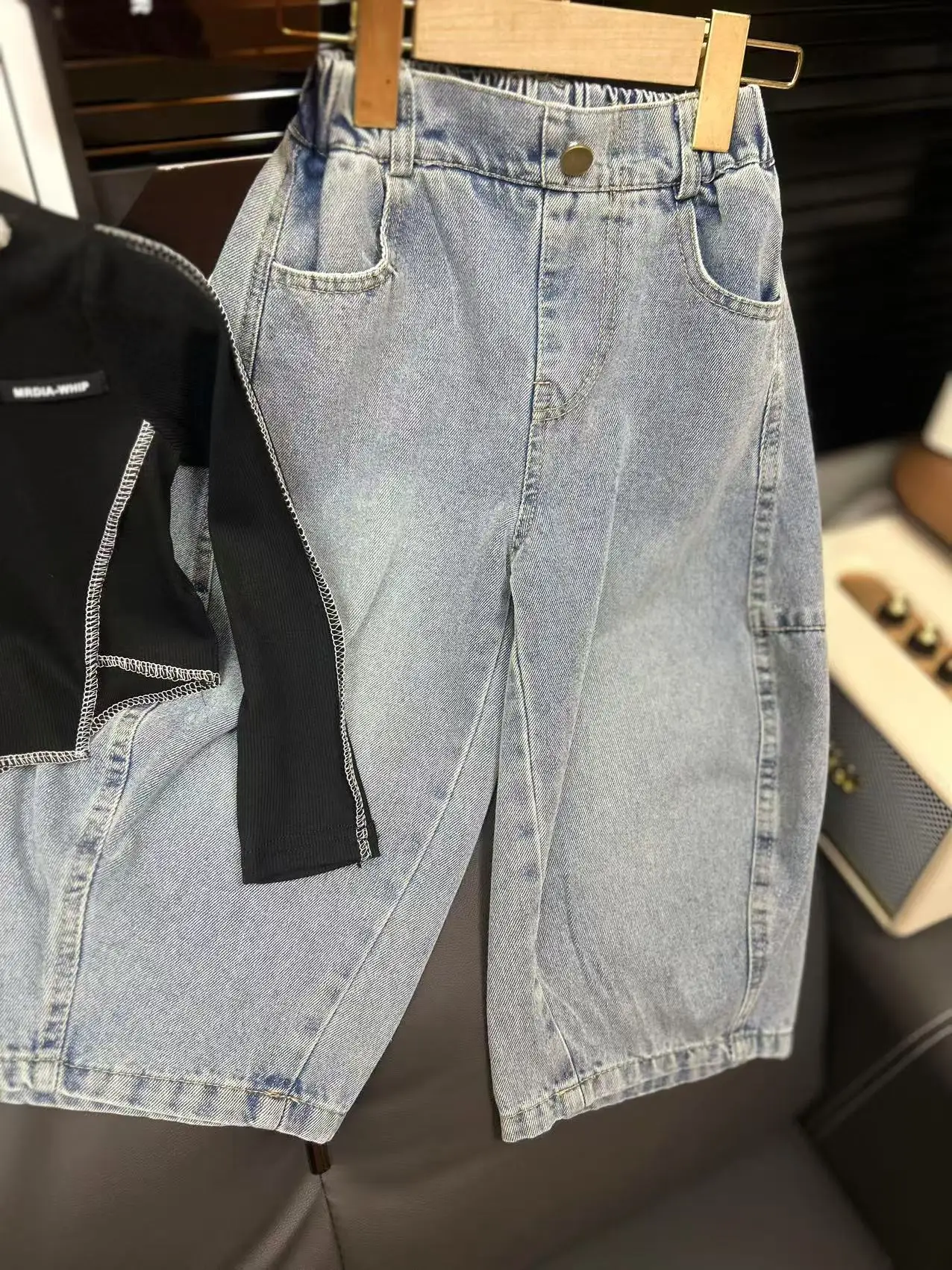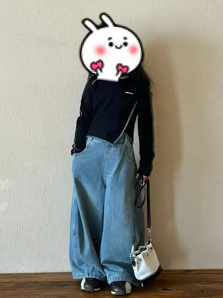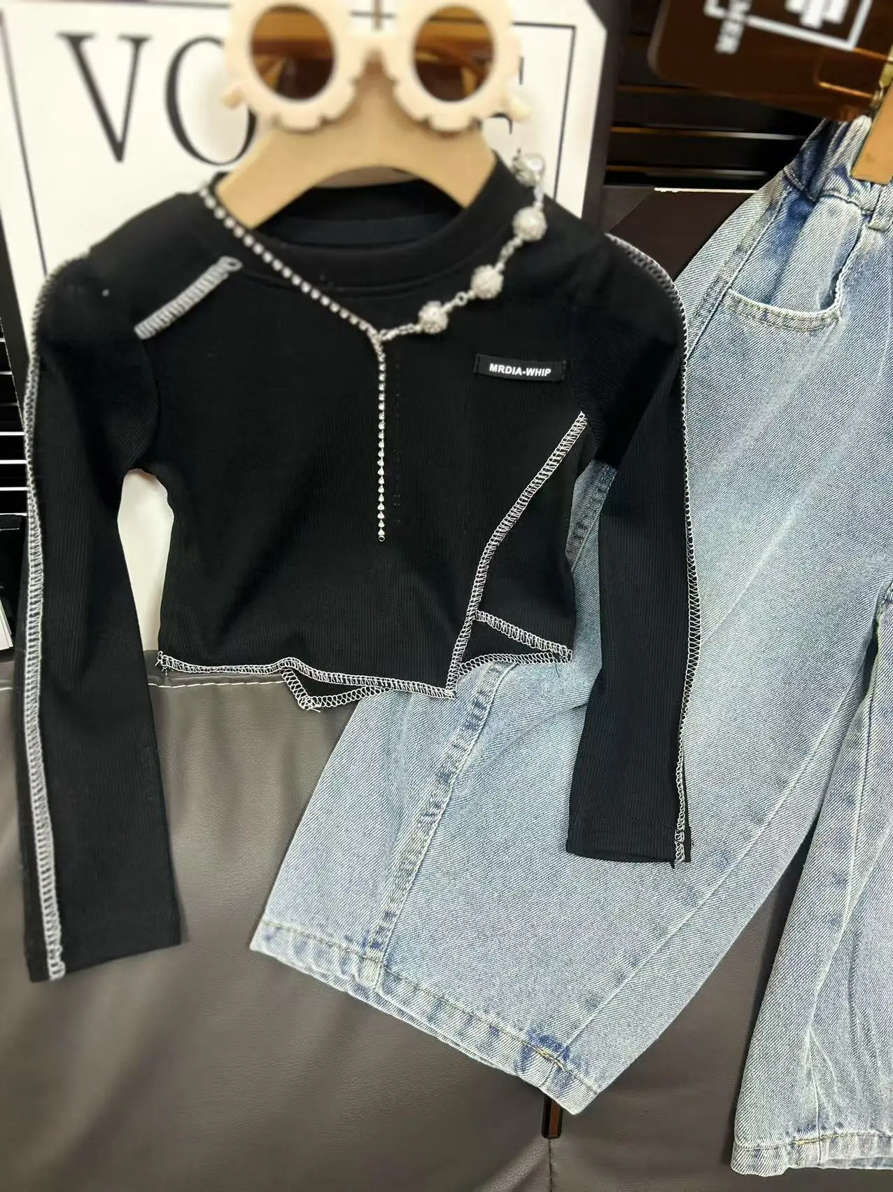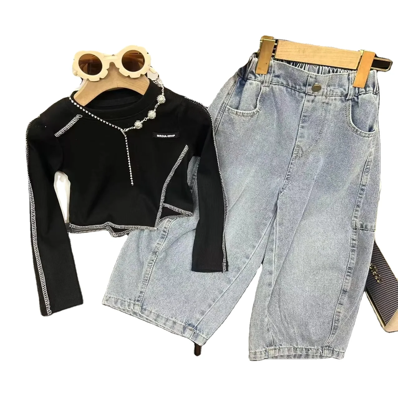2026 Korean Casual Child Outfit Spring New Fashion Breathable Kids Irregular Long Sleeve Top Loose Jeans 2Pcs Girl Clothing Set