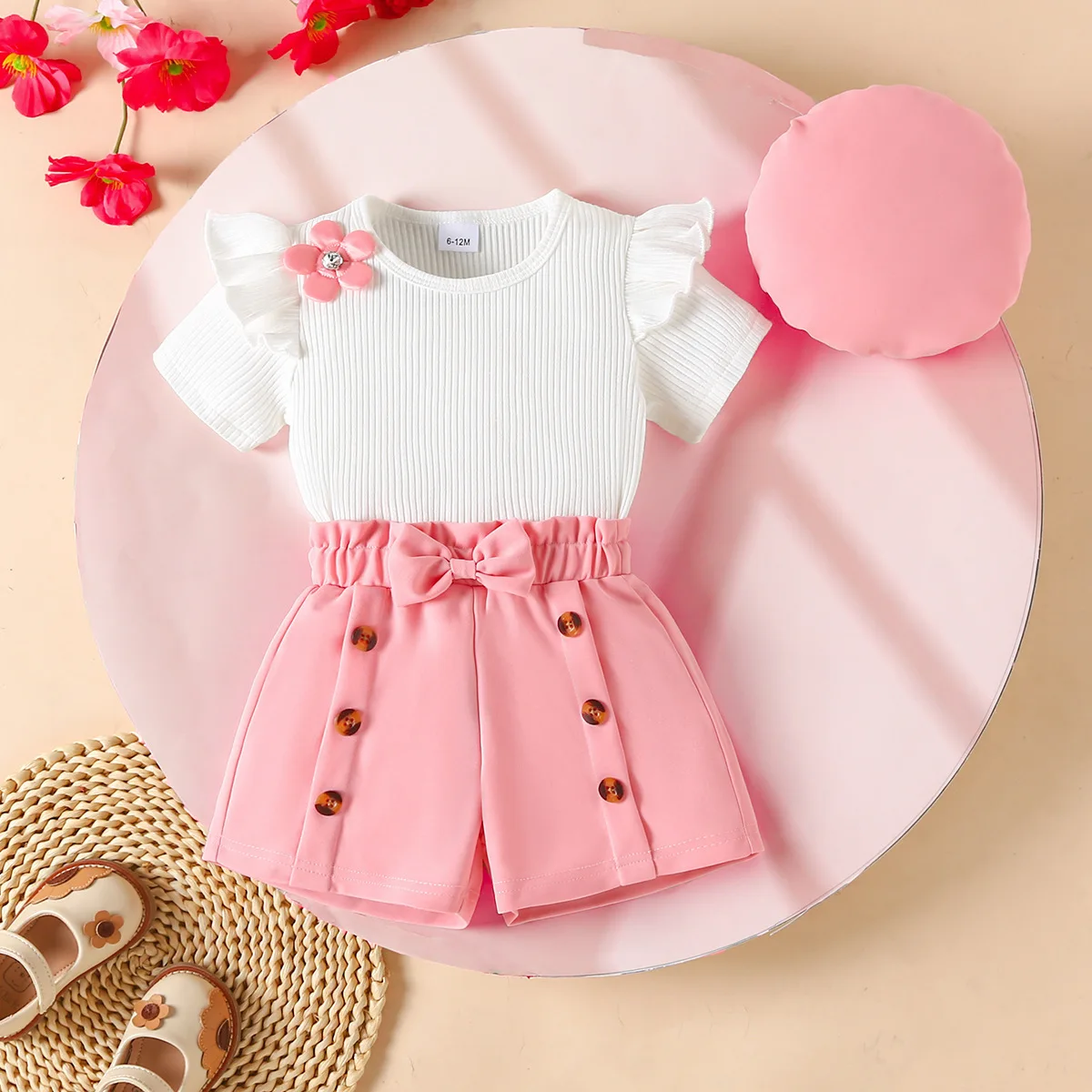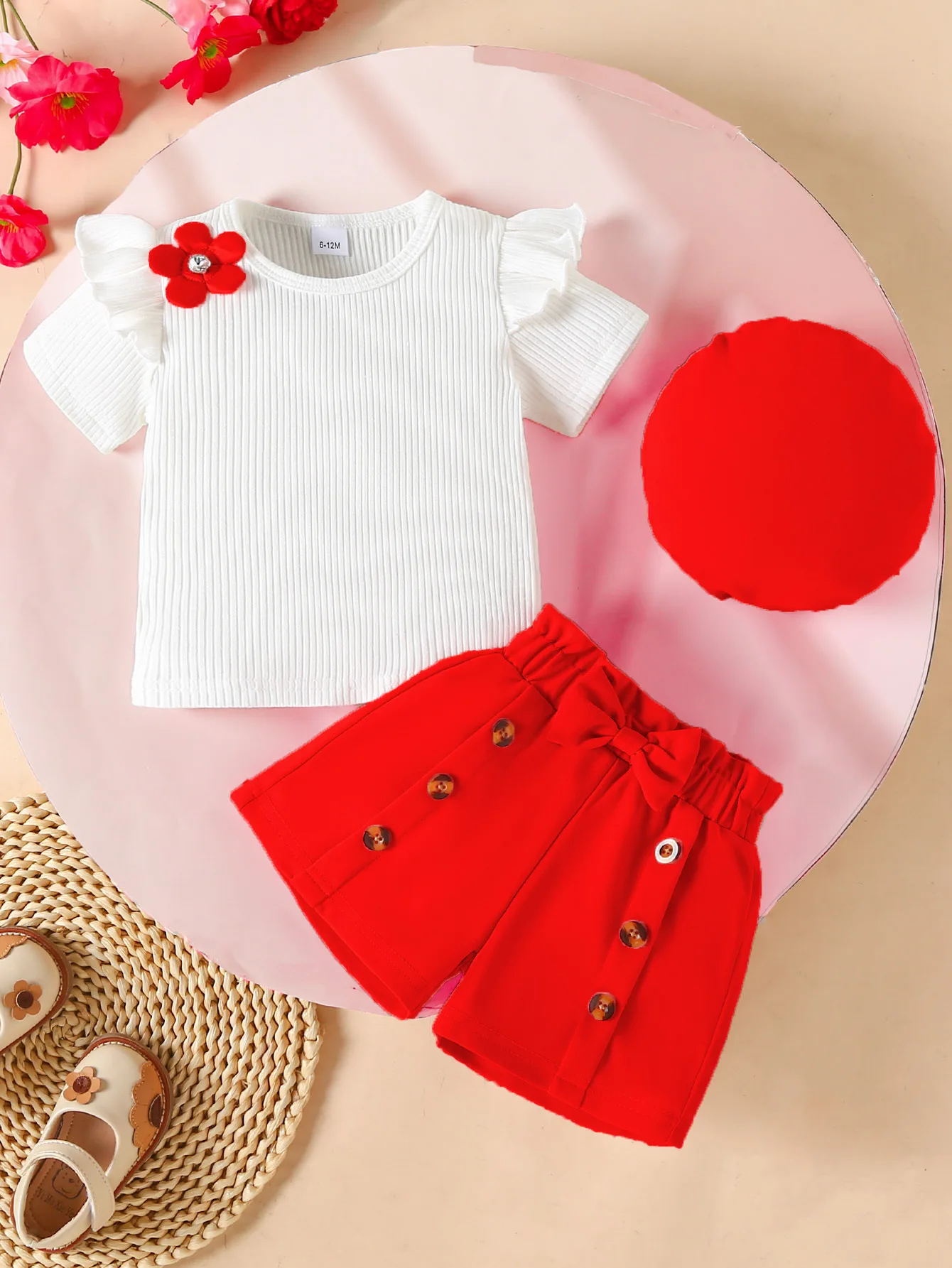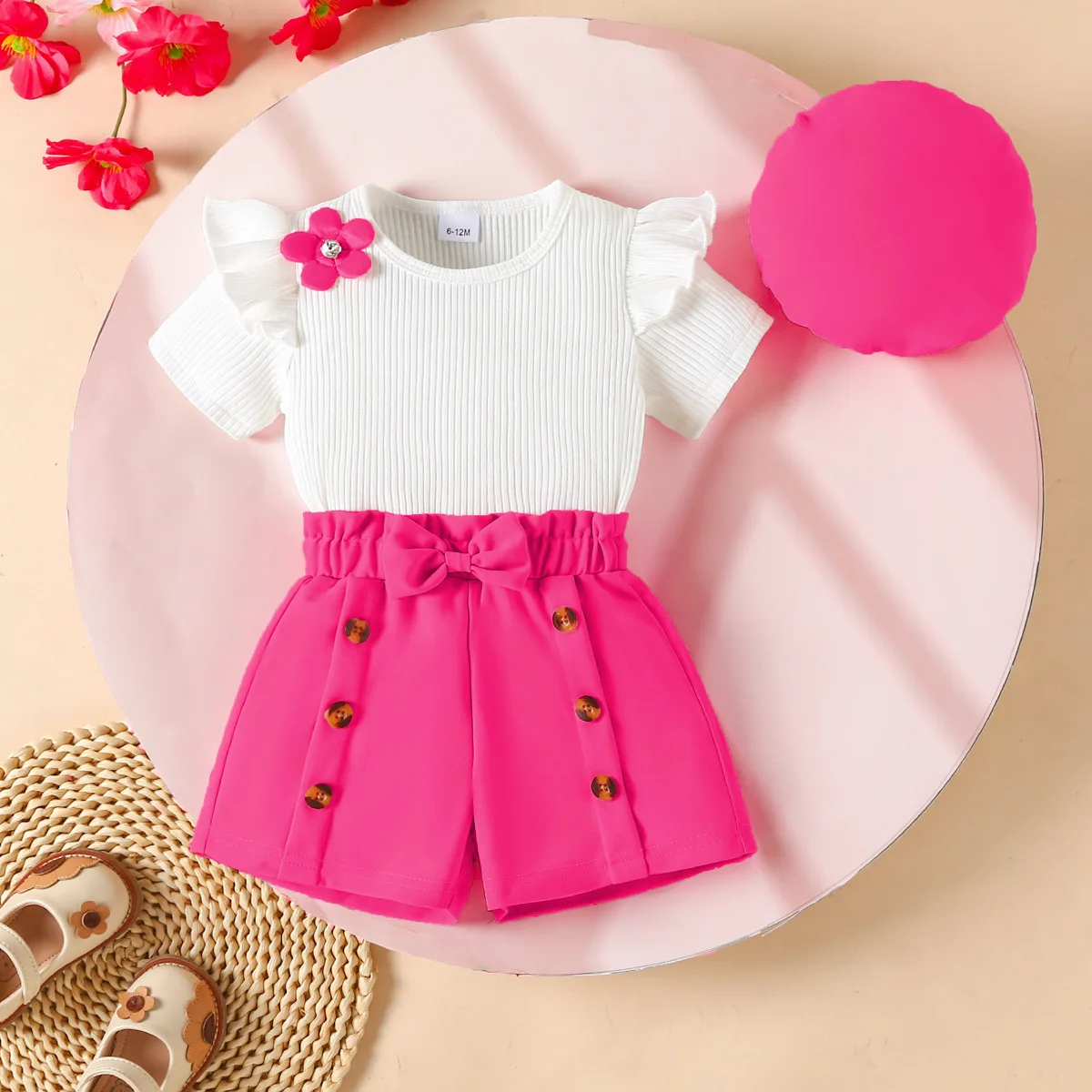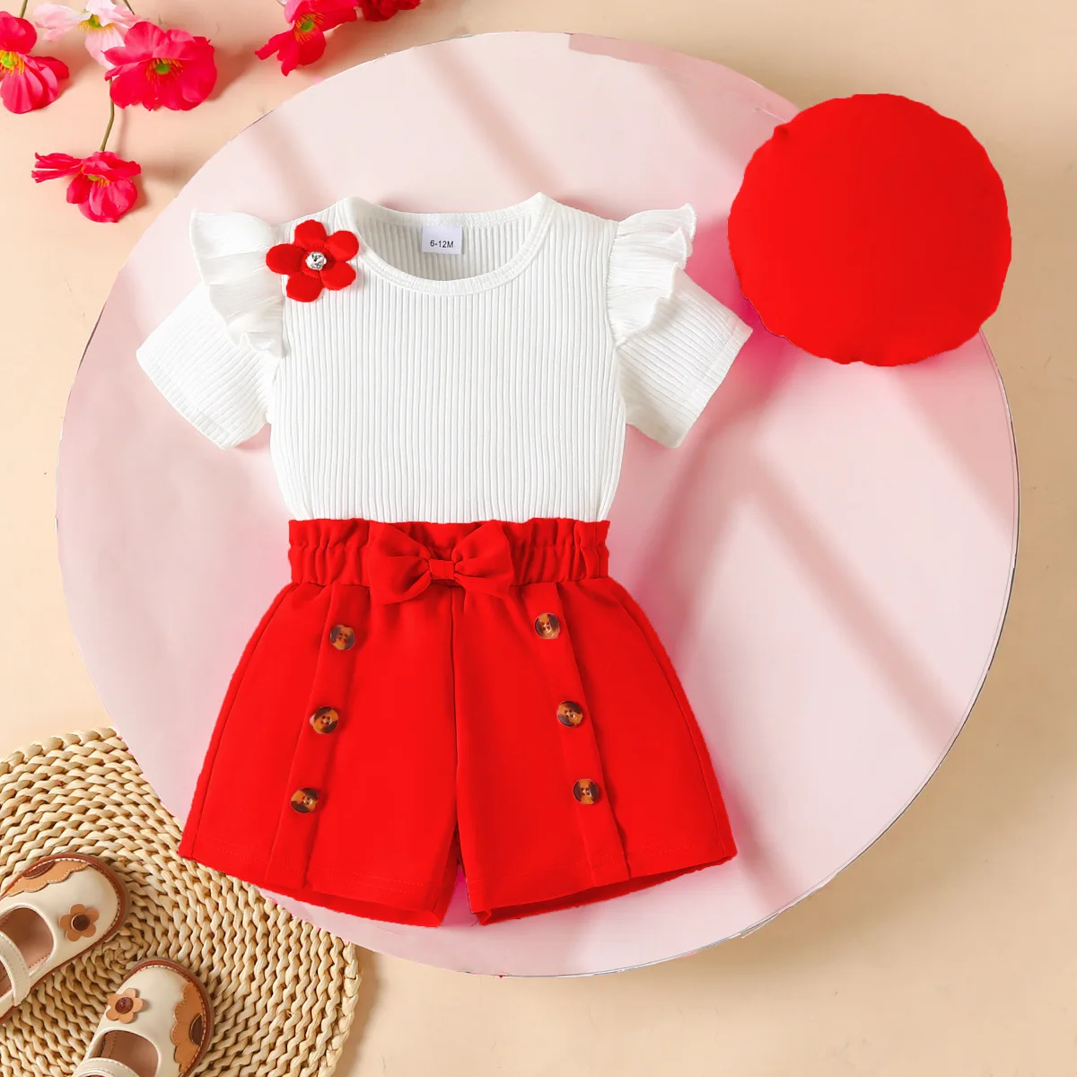 2026 Summer Toddler Girl Clothing Set Fashion 3d Flower Knit Top Button Shorts with Hat 3pcs Suits Fashion Kids Clothes