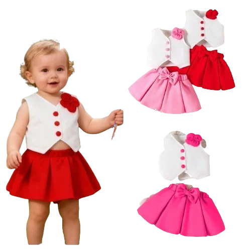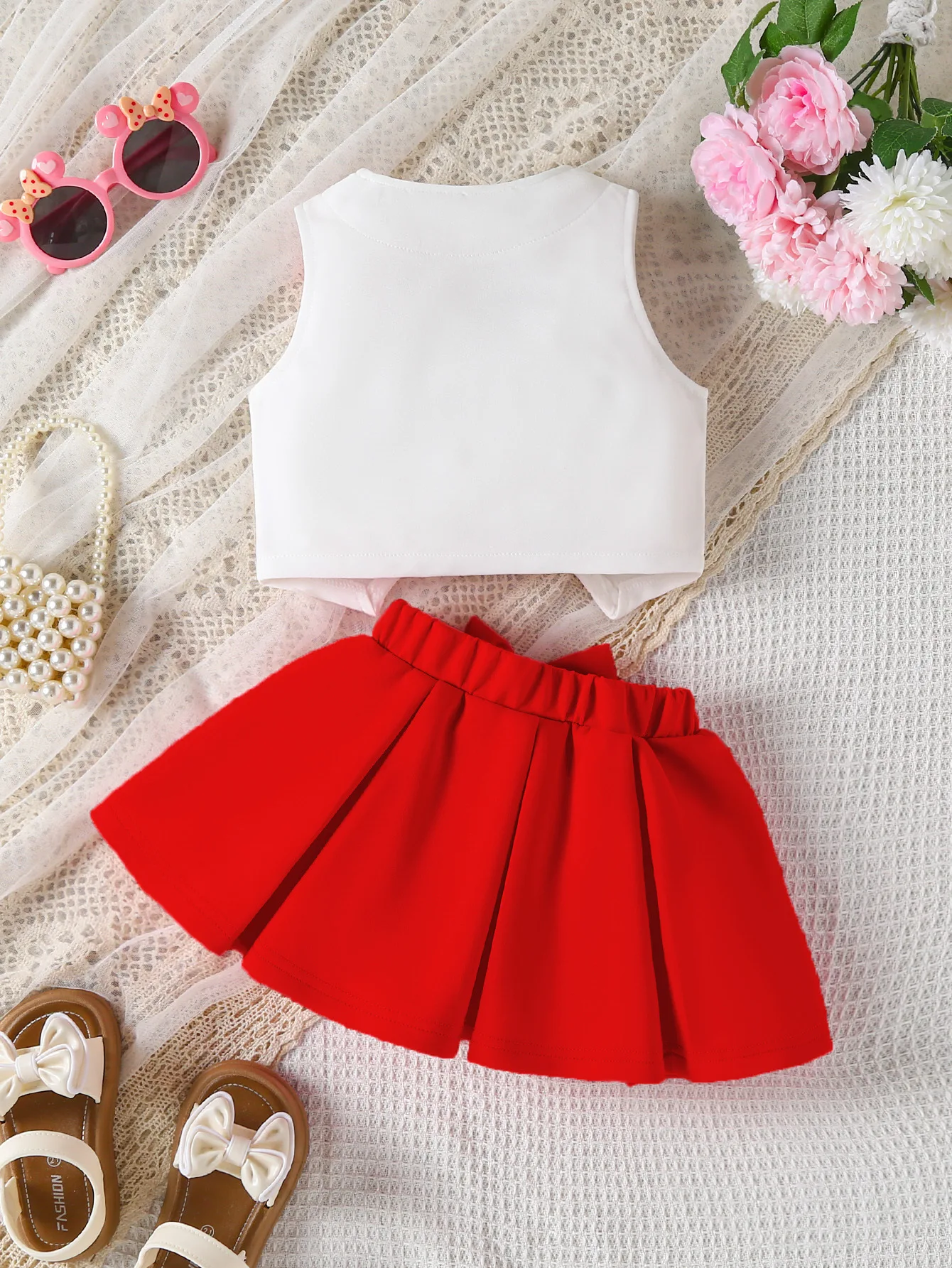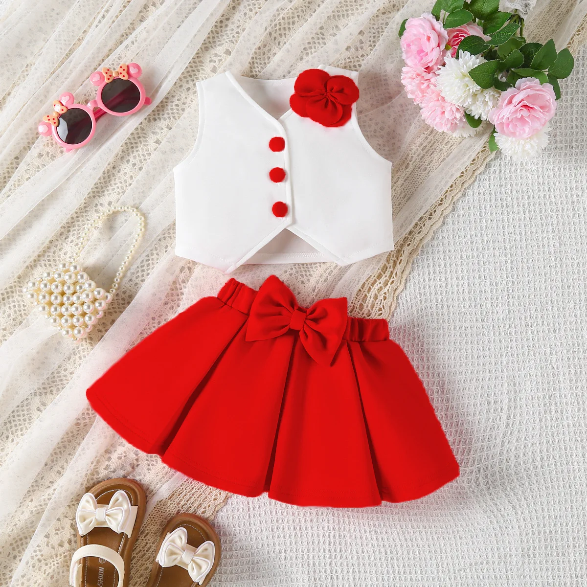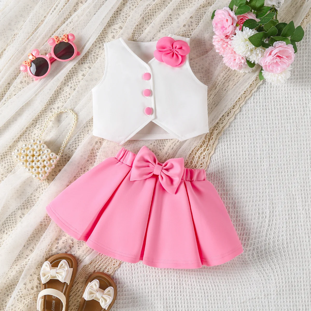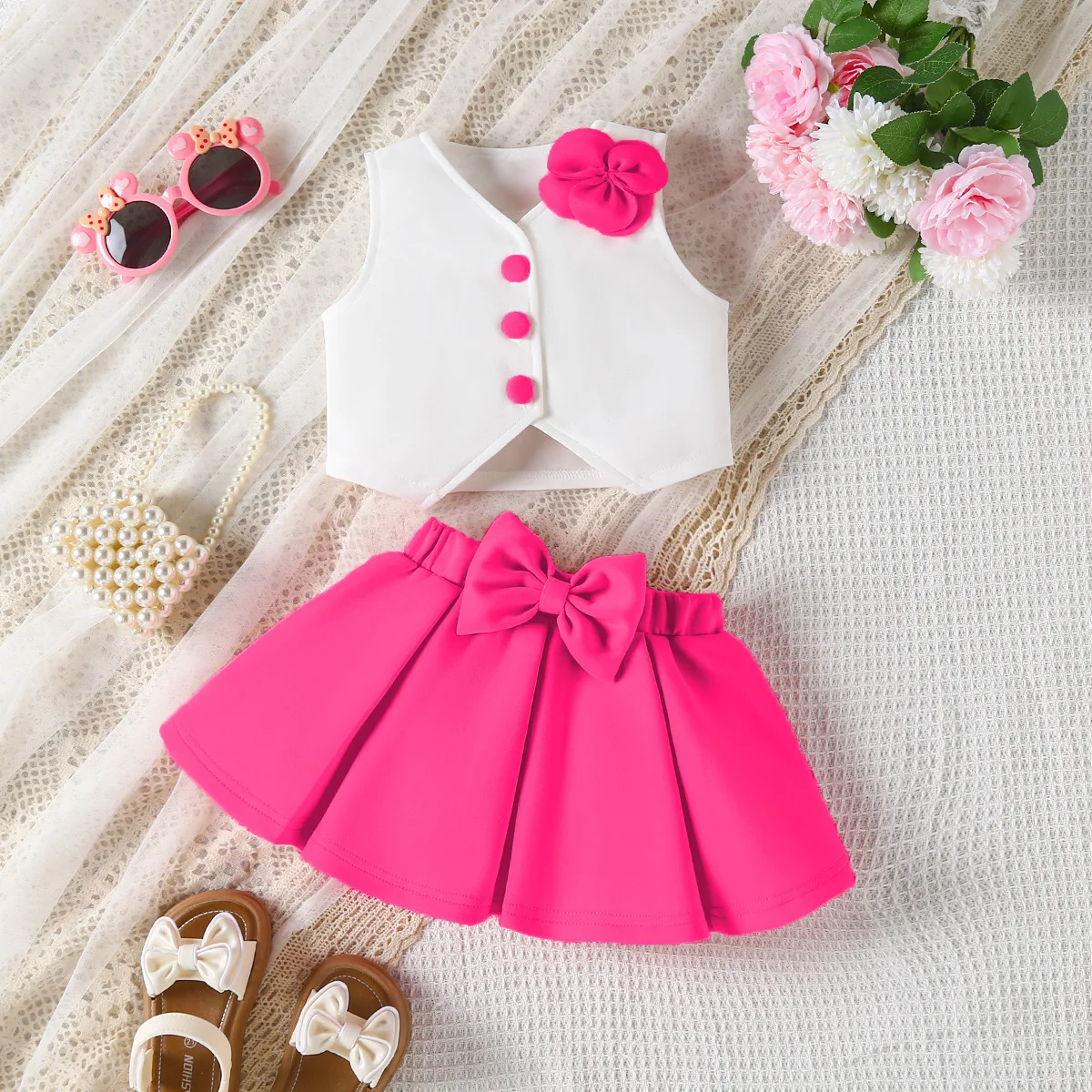 2026 Summer Girls Outfit 3D Flower Vest Pleated Bow Skirt Two Piece High Quality Children Clothing Wholesale Korean Kids Clothes