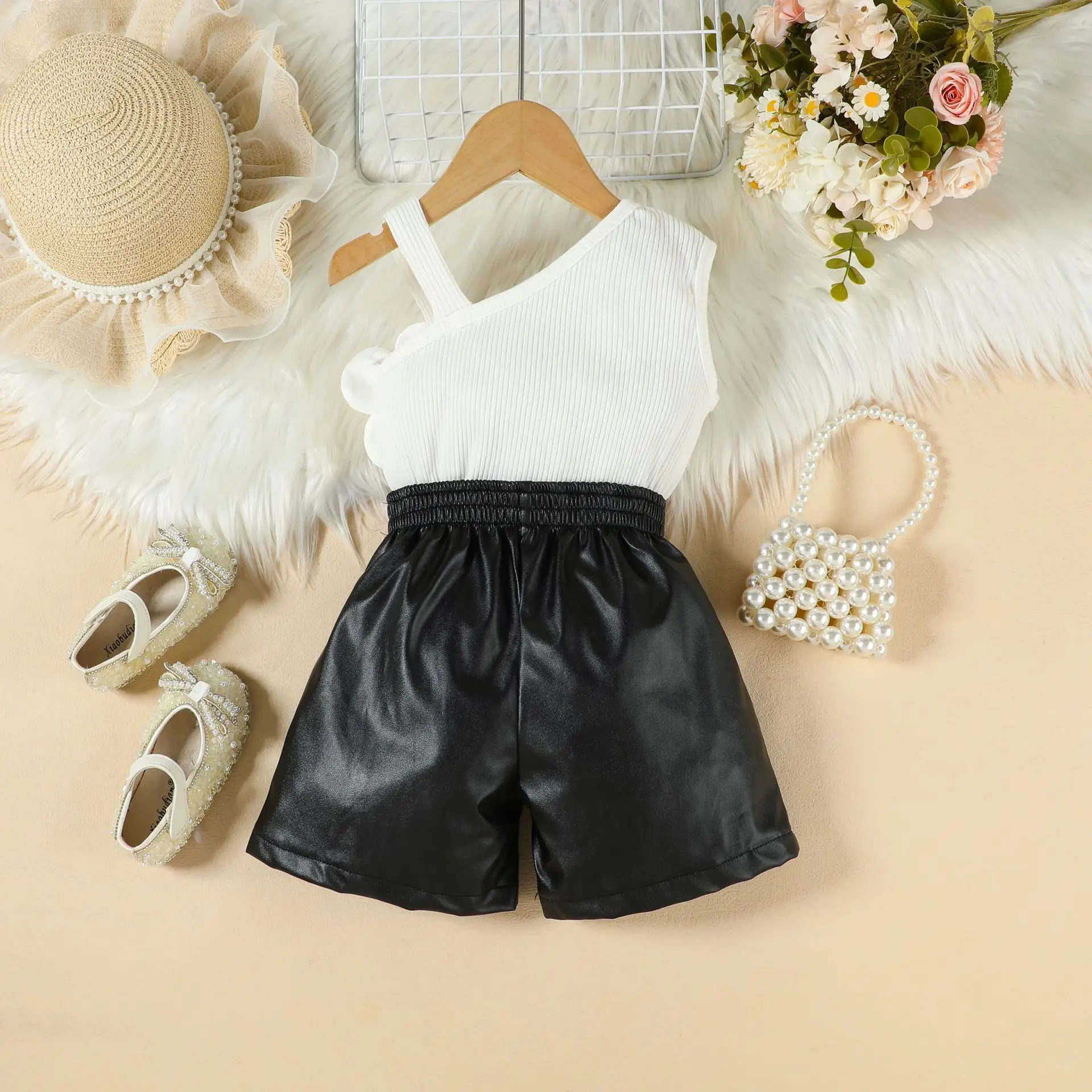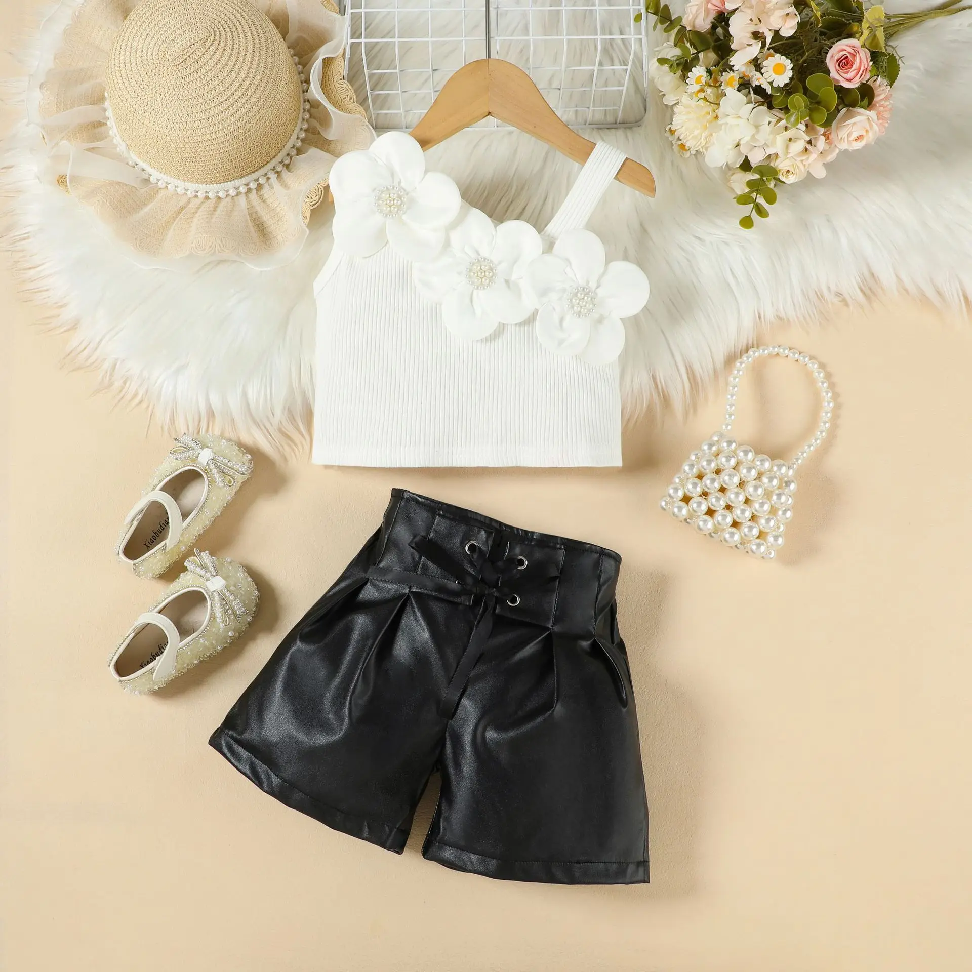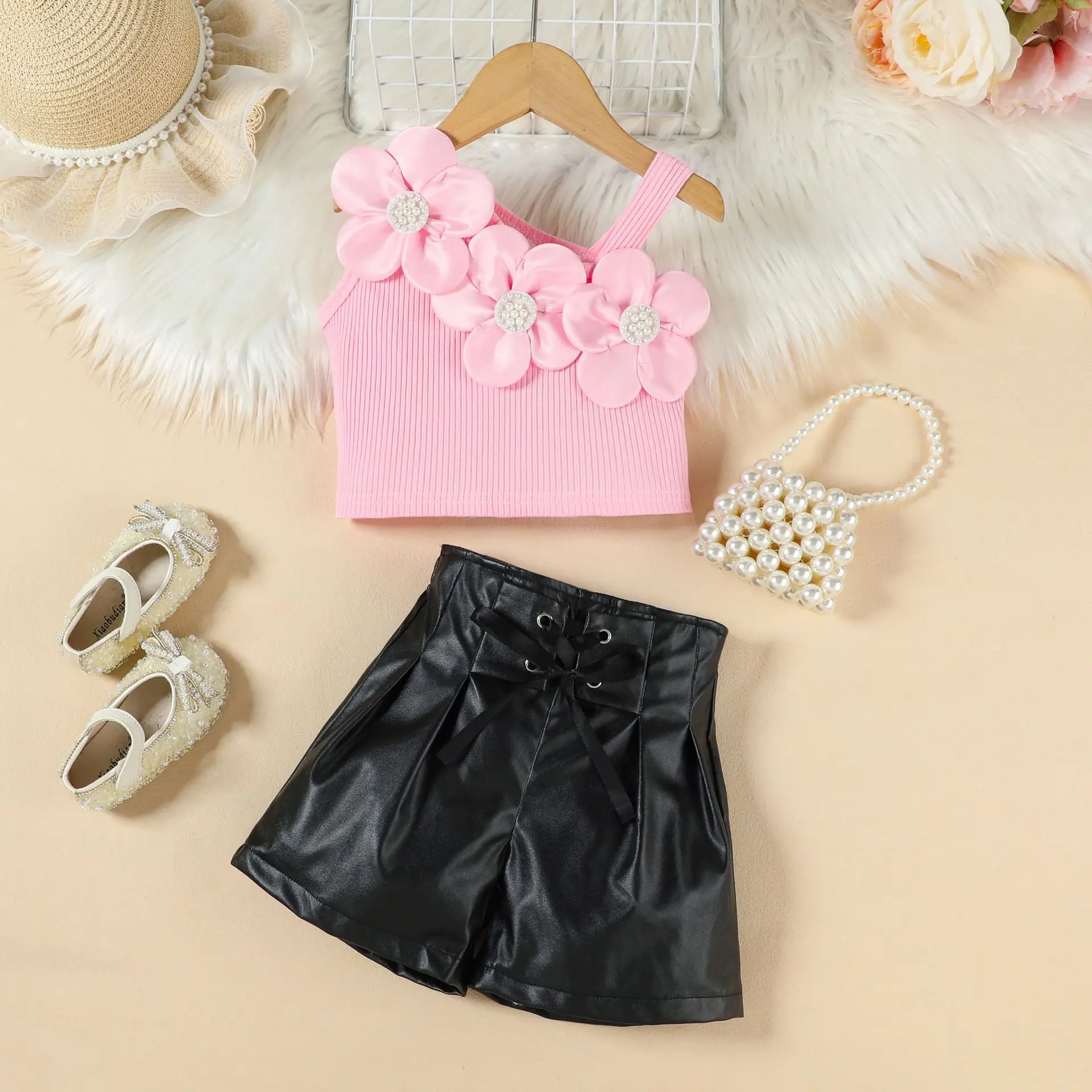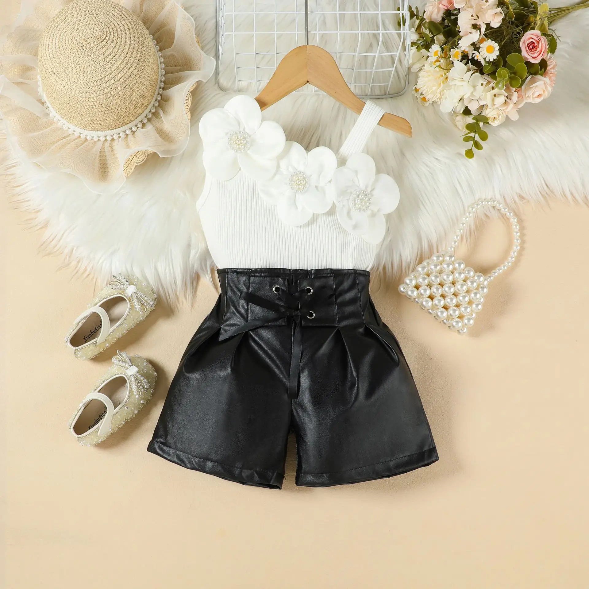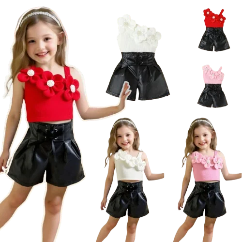 2026 Summer Girls Clothing Set Fashion 3D Flower Off-shoulder Top PU Leather Shorts 2pcs Children Wholesale Kids Clothes