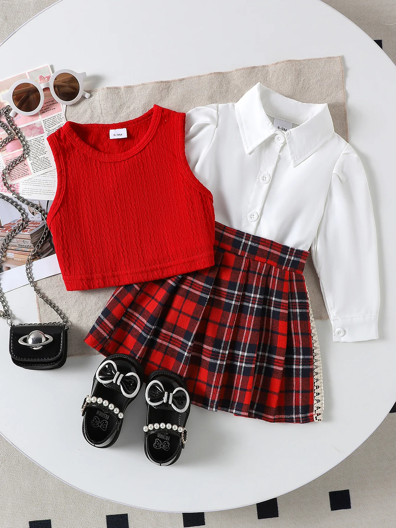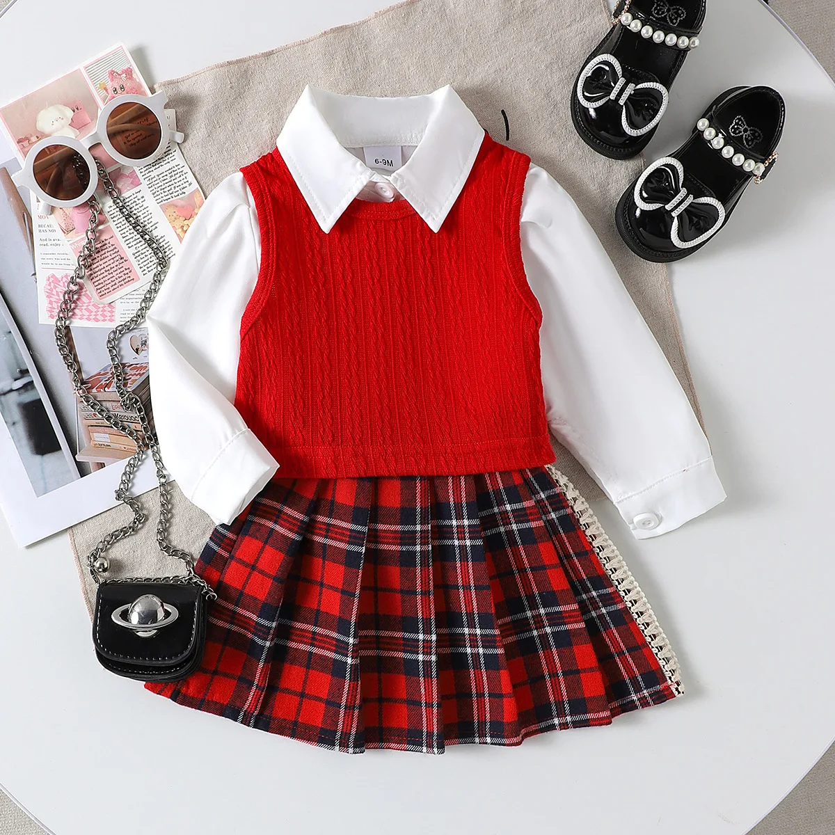Kids Wear Manufacturers 2026 Autumn Winter Toddler Clothes Shirt Knit Vest Christmas Plaid Skirt 3pc High Quality Girls Clothing