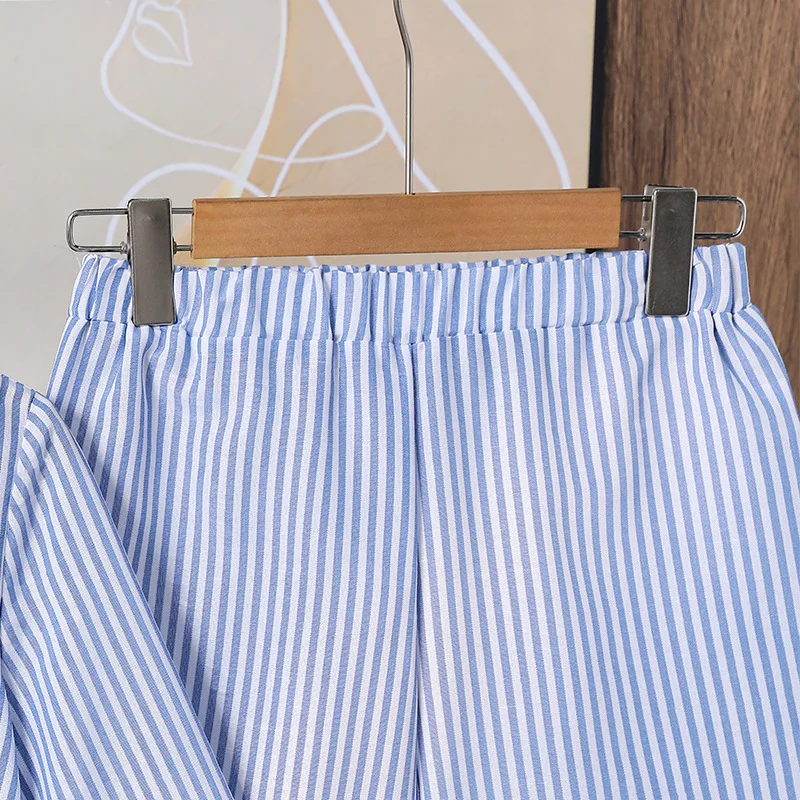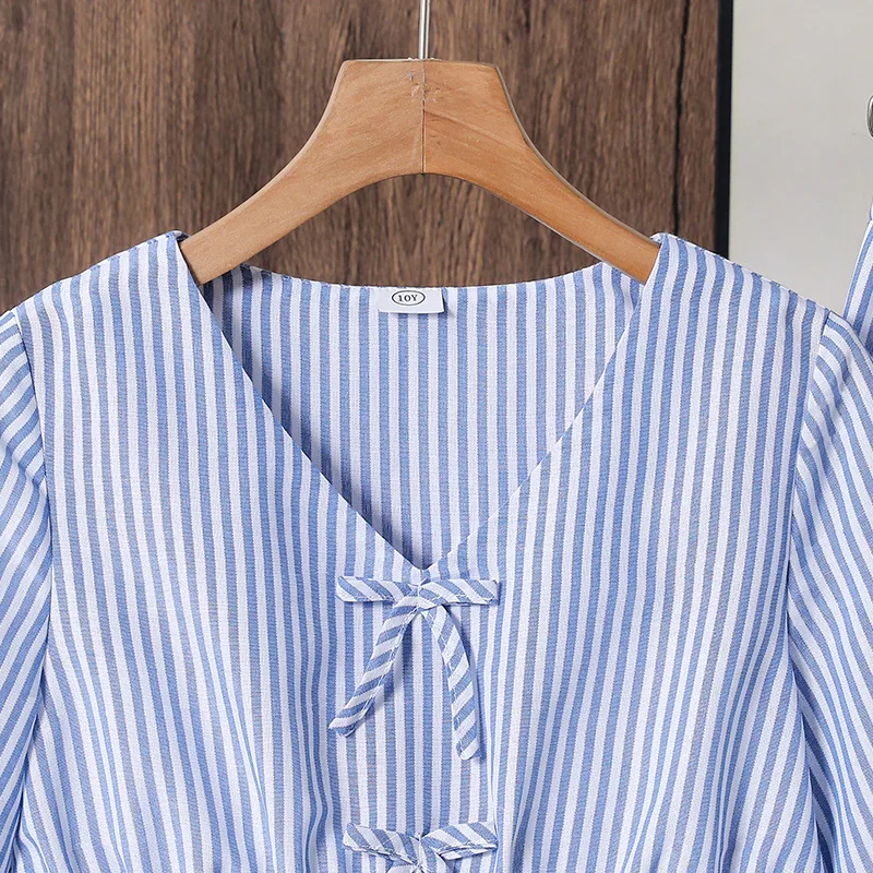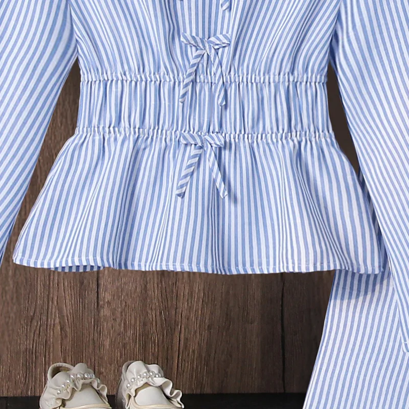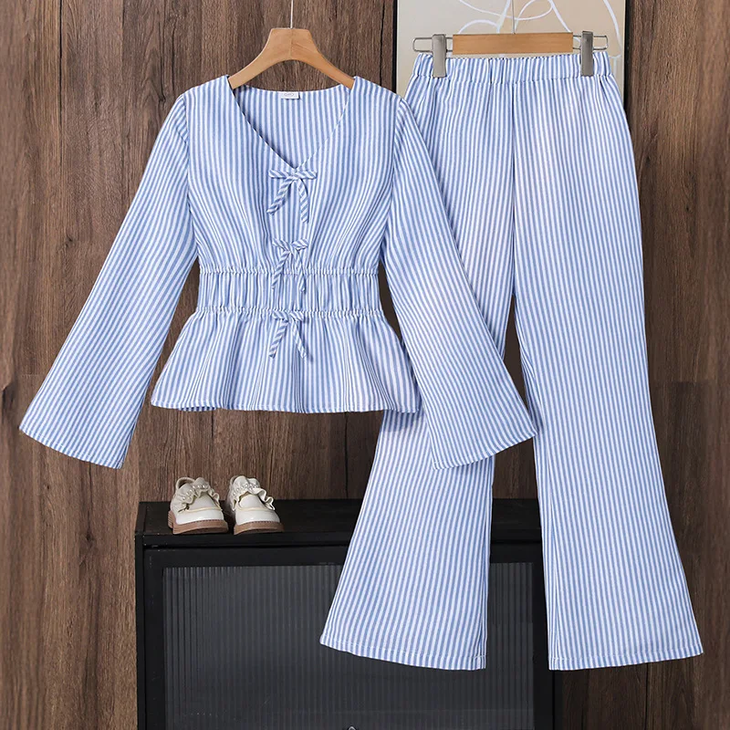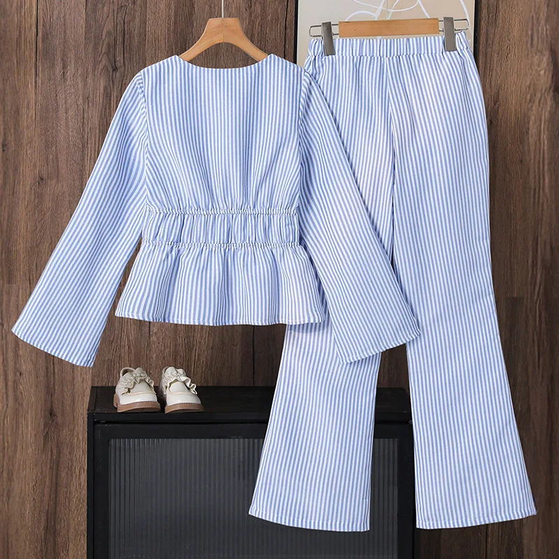 2026 Spring New Design Big Girl Garment Long Sleeved Striped Long Sleeved Shirt Flared Pants 2 Pcs Casual Teenage Clothes Set