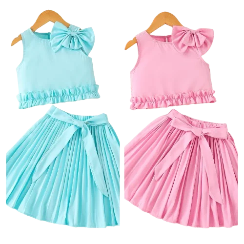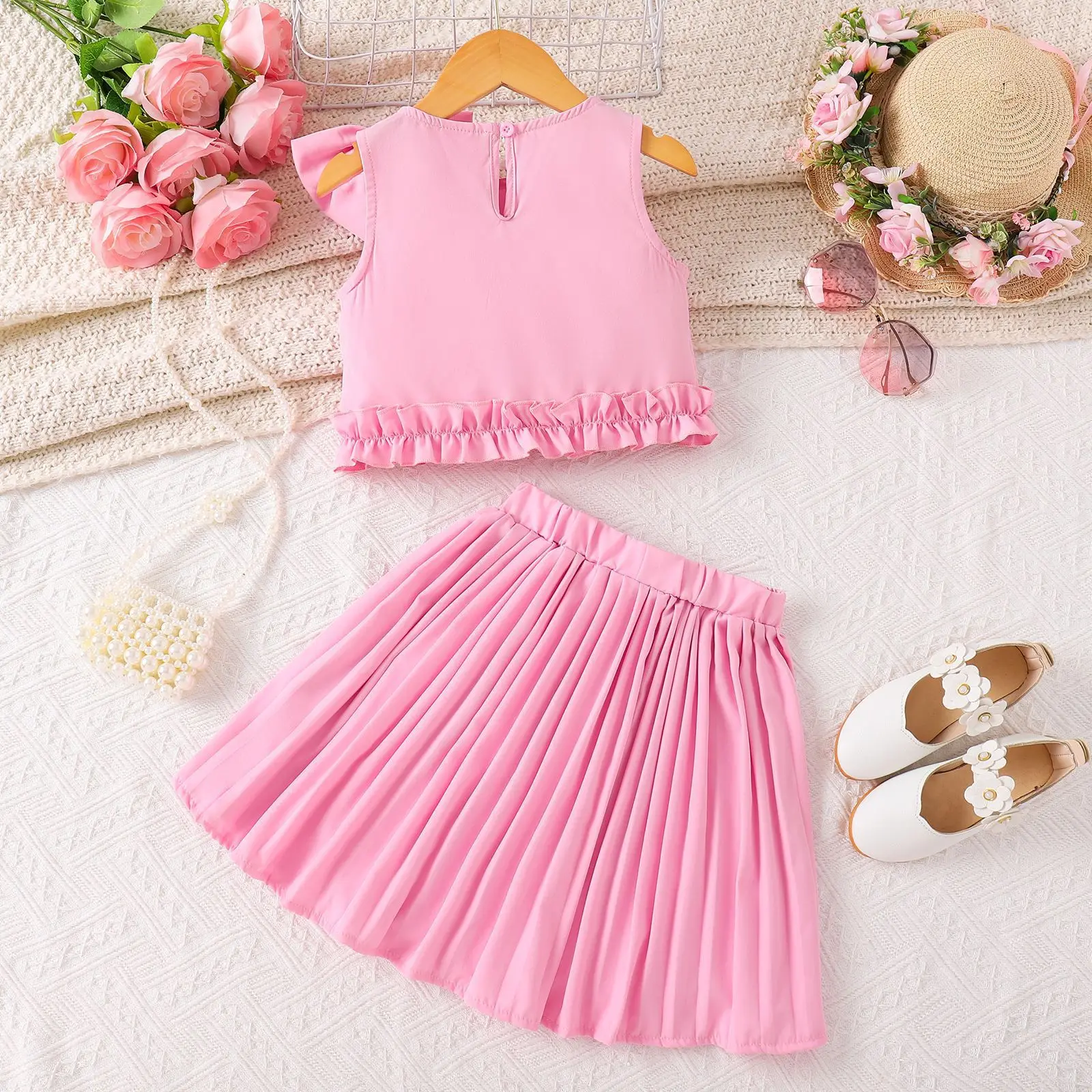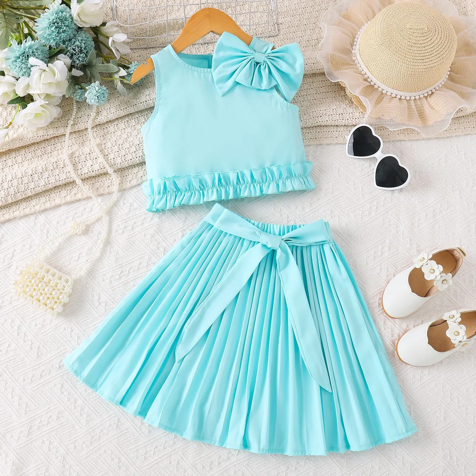 Boutique 2026 Summer Kids Fashion Clothes Sleeveless Bow Tie Blouse Pleated Skirt Two Piece Set Wholesale Girls Clothing