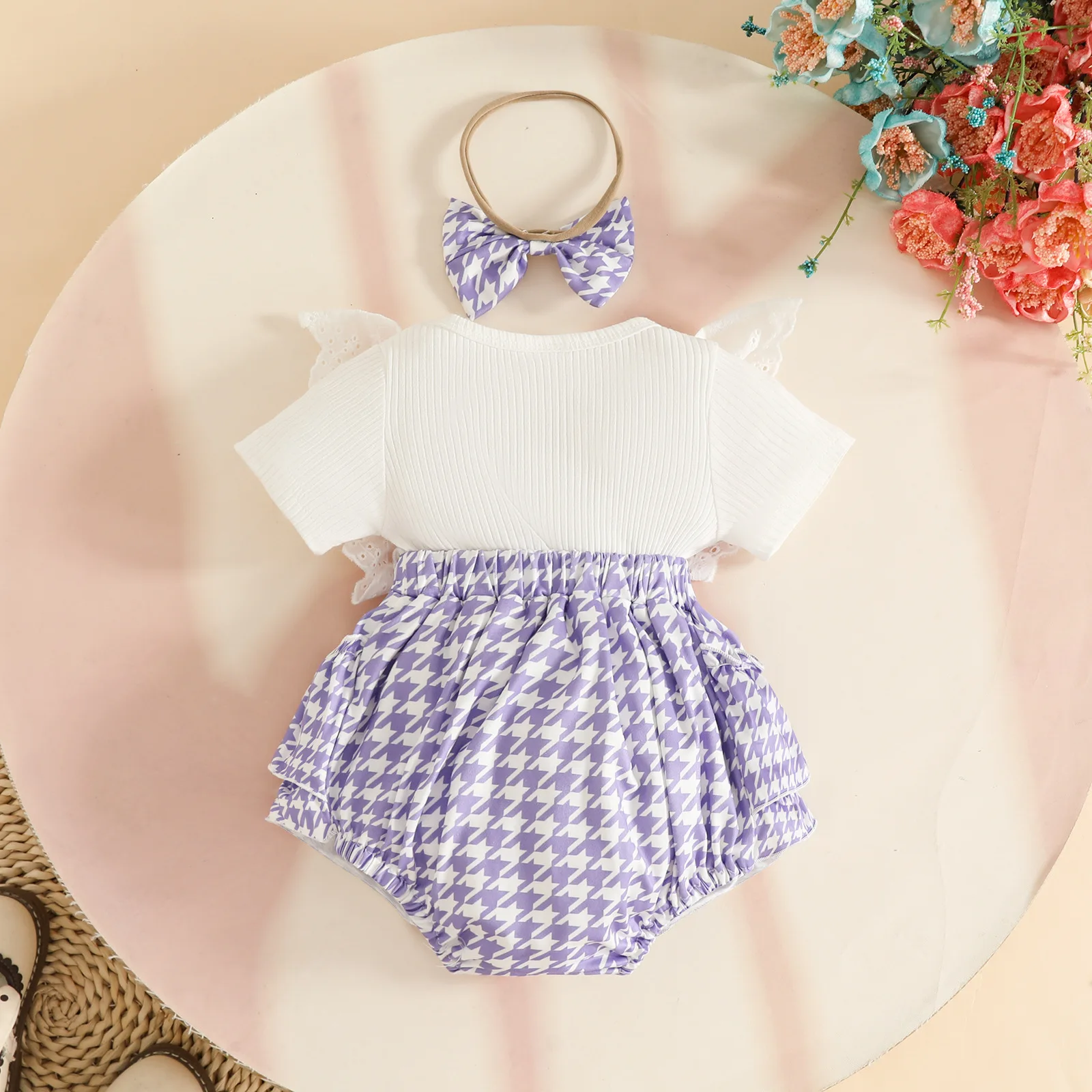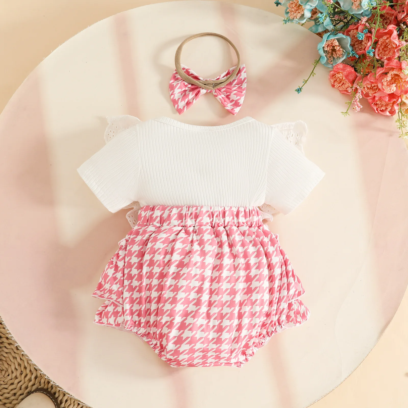 2026 New Born Infant Clothing Set Short Sleeve Ribbed Top Ruffled Plaid Skirt Bow Headband 3pcs Baby Girl Summer Clothes