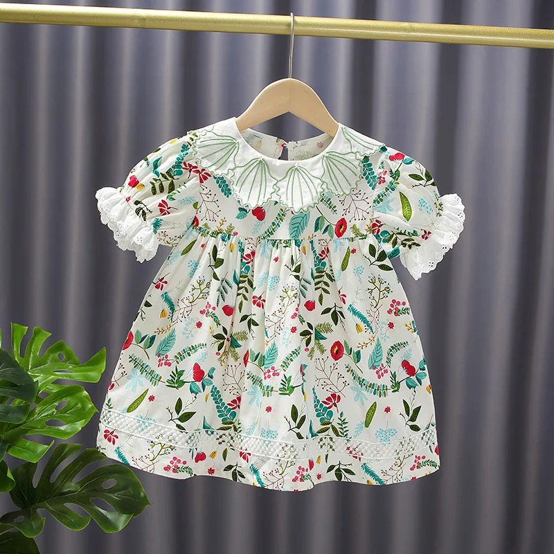 Factory Price Casual Girls Sweet Dress Smocked Dress O Neck Floral Print Custom Girl's Shell Lace Collar Baby Girls Out Dress